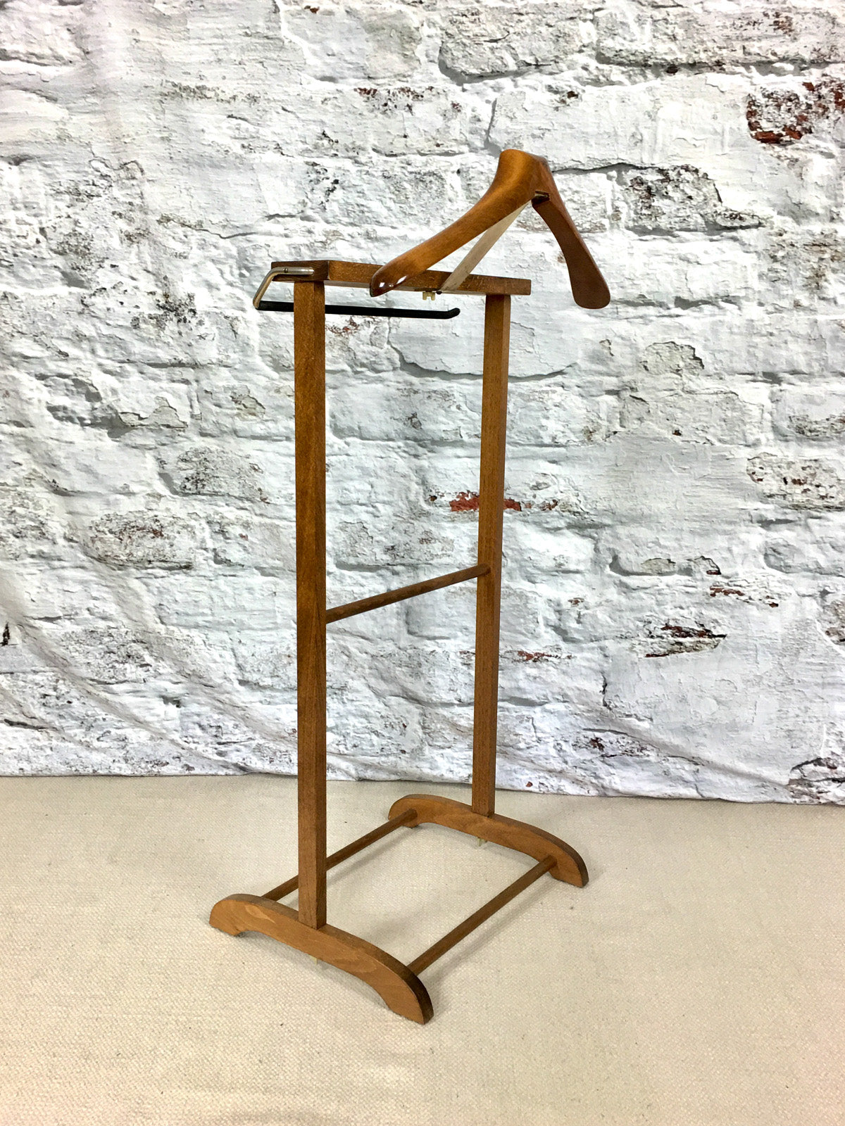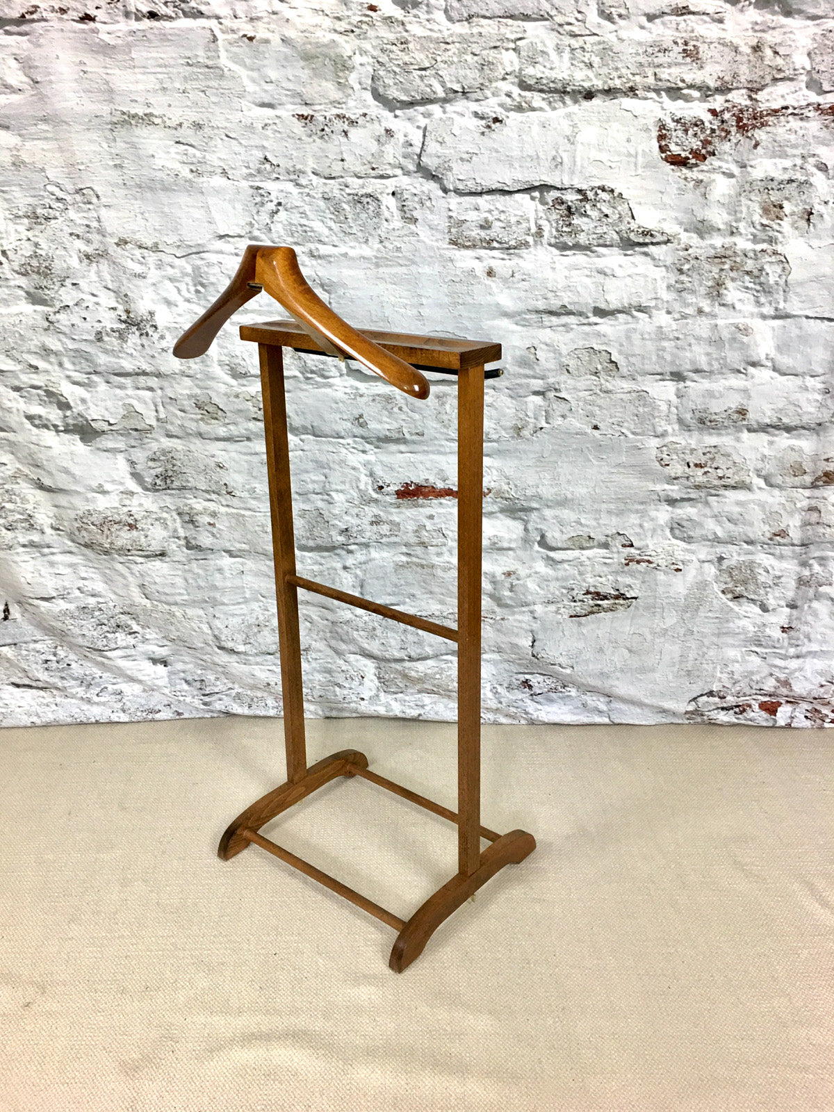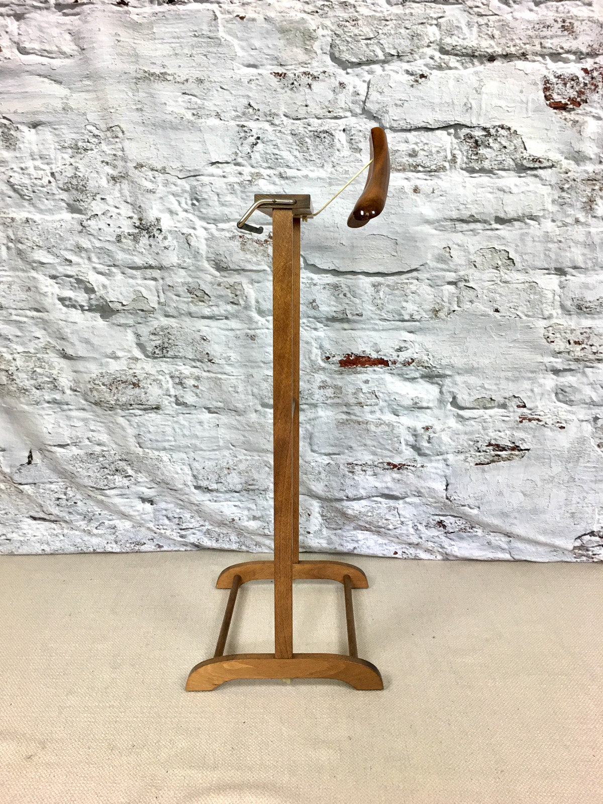 Hier im Angebot befindet sich ein gut erhaltener Stummer Diener aus den 1950er Jahren. Er wurde aus Buchenholz gefertigt und steht, nach wie vor, sehr stabil auf den querverstrebten Beinen. Praktisch, die kleine Ablagefläche für Uhren oder Manschettenknöpfe. Unverzichtbar, die Gummierung an der Hosenhalterung, dass die edlen Stoffe nicht von der Stange rutschen. Hat man einmal mit dem mute servant, wie die Engländer zu sagen pflegen gelebt, möchte man ihn nie wieder hergeben.