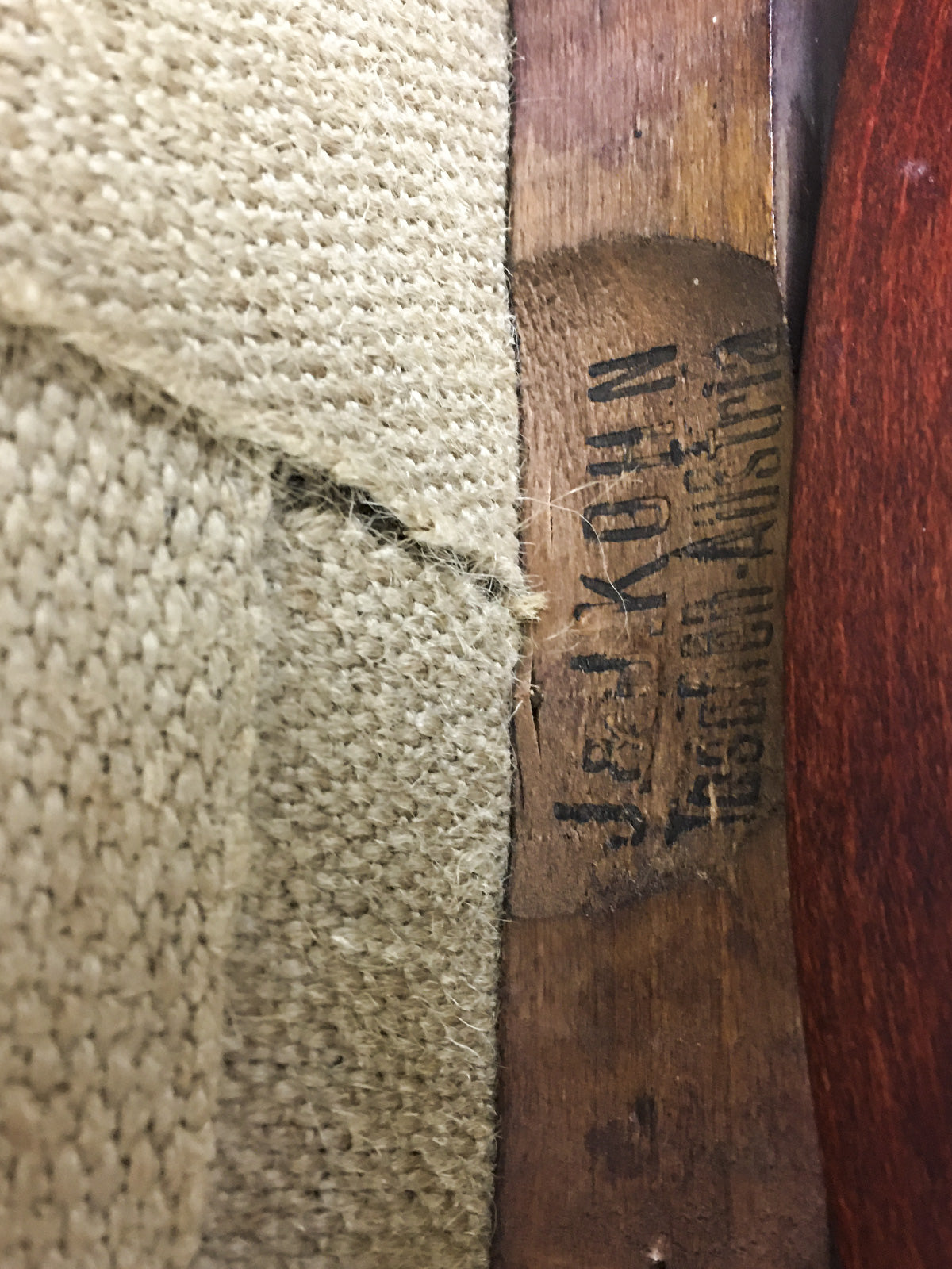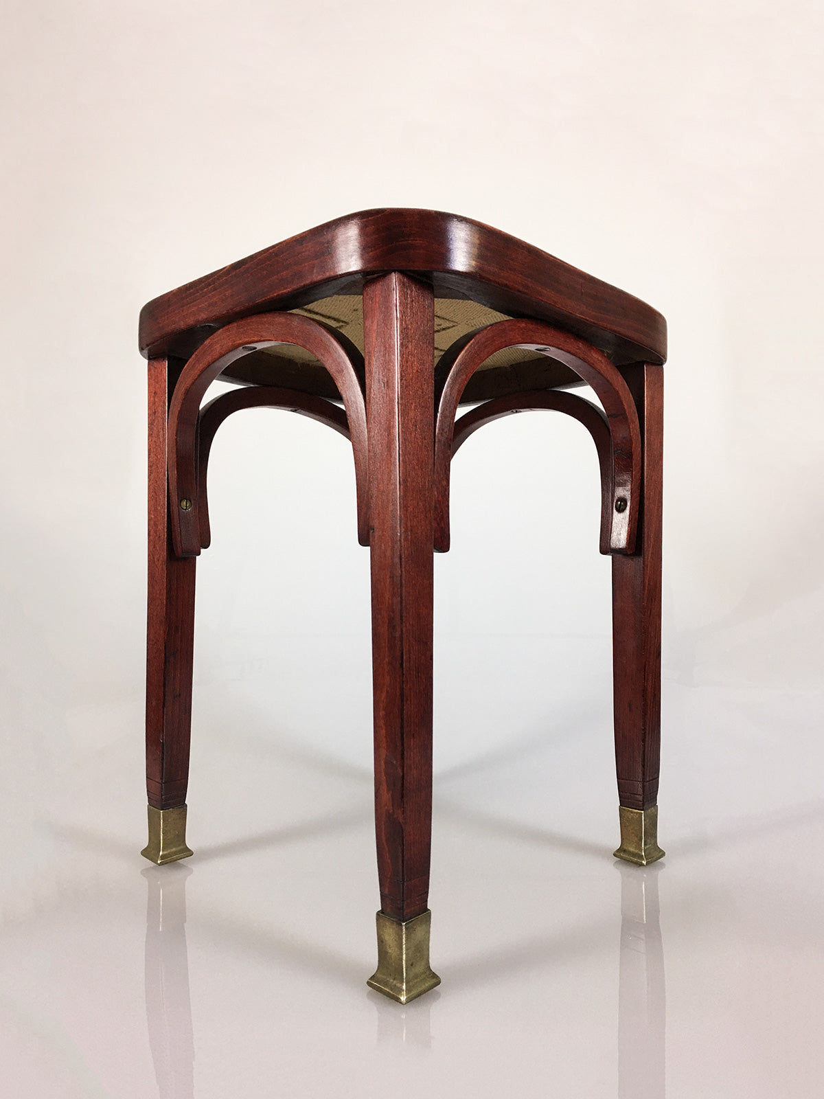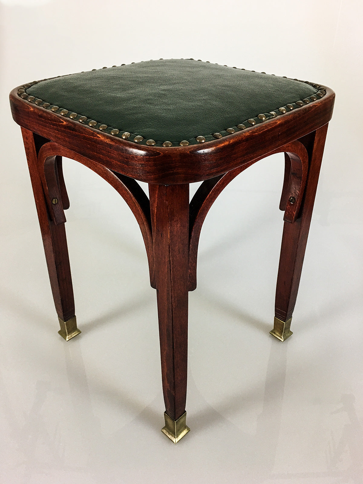 Dieses seltene original von Gustav Siegel wurde 2014 von mir in einem Hinterhof in Oberösterreich entdeckt. Der Hocker wurde neu gepolstert, das Buchenholz auf die Originalfarbe gebeizt und wie damals mit Schellack poliert.