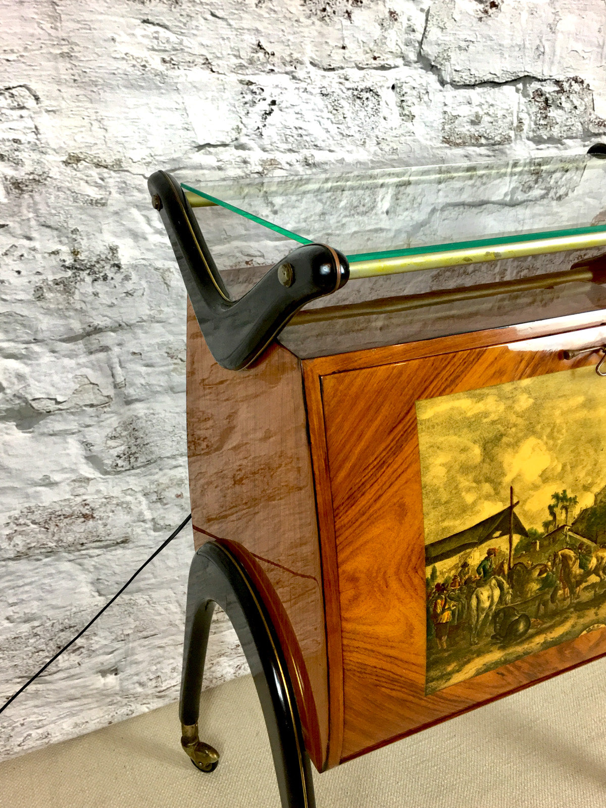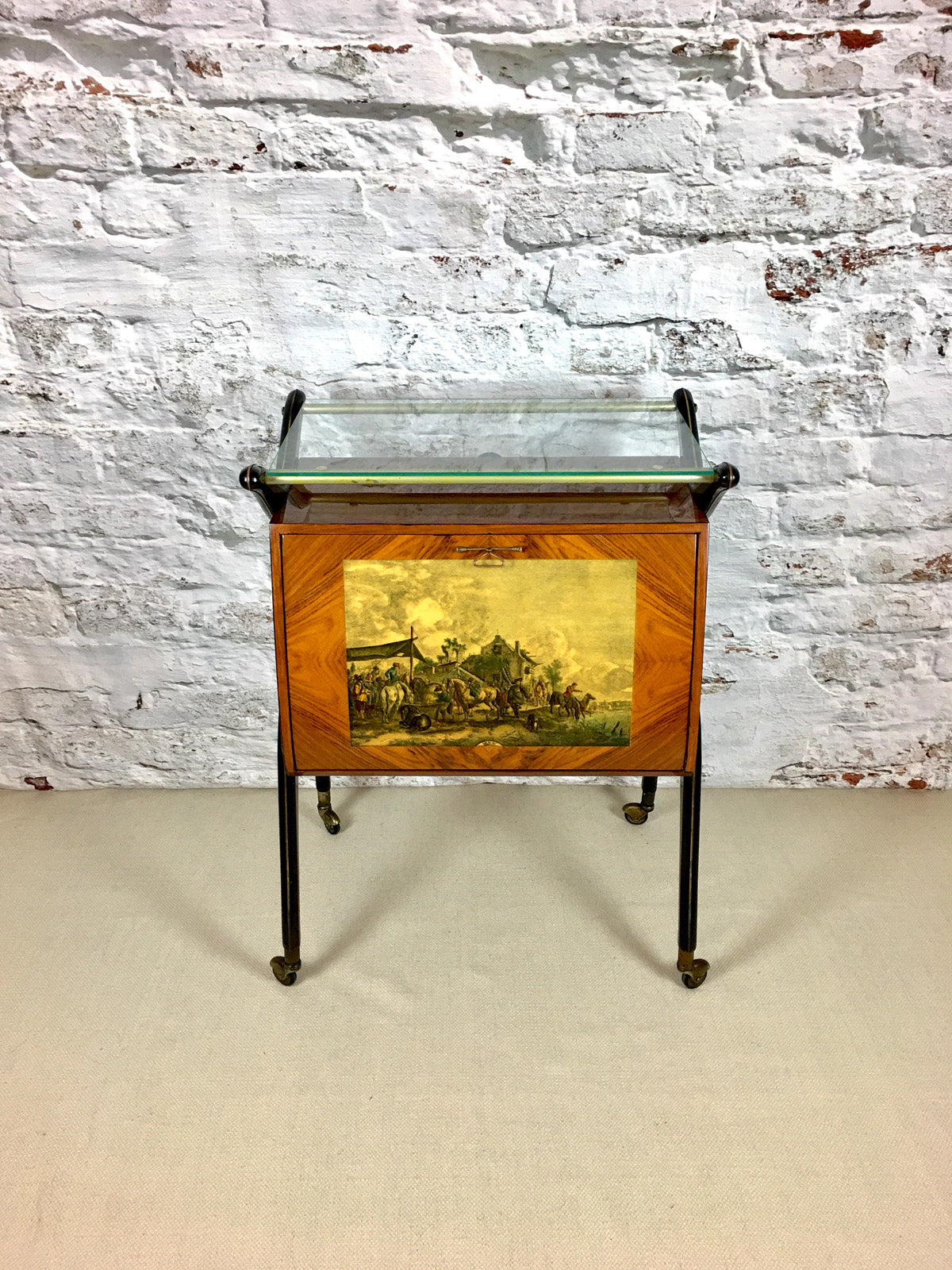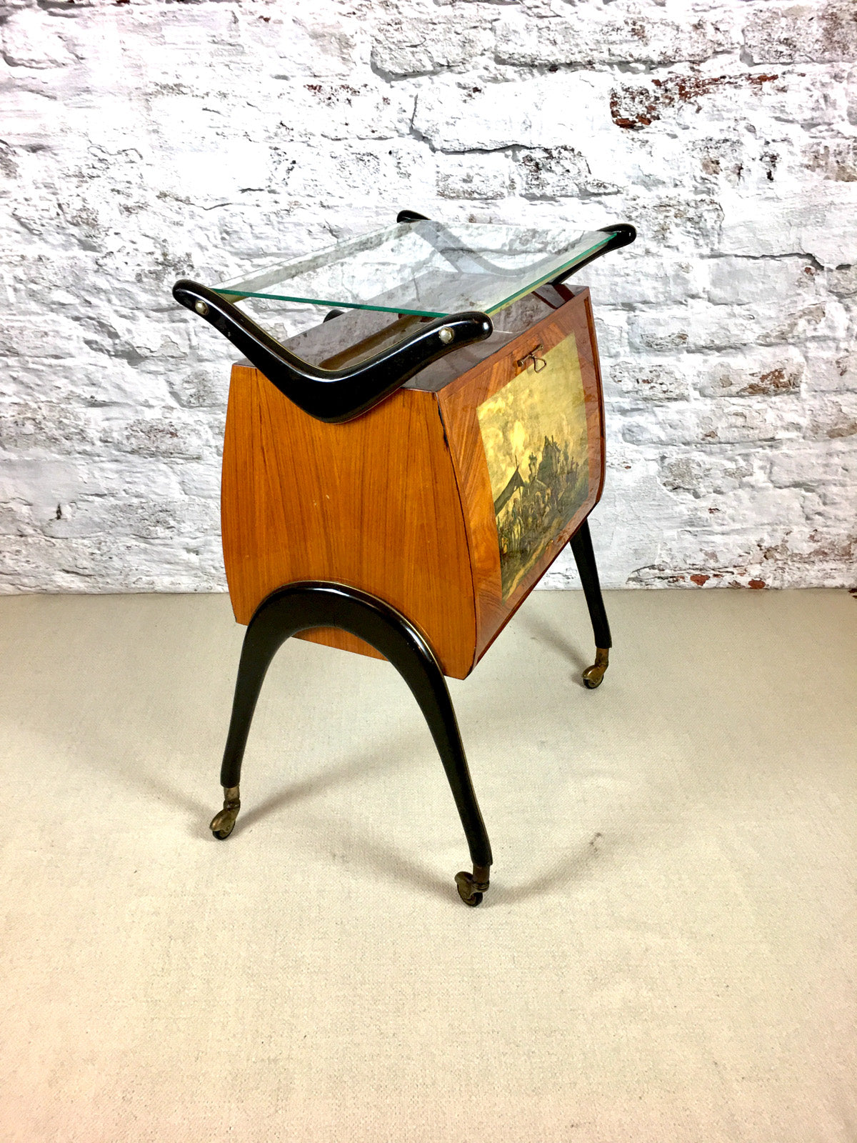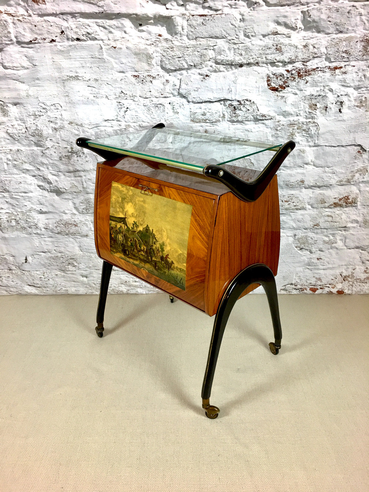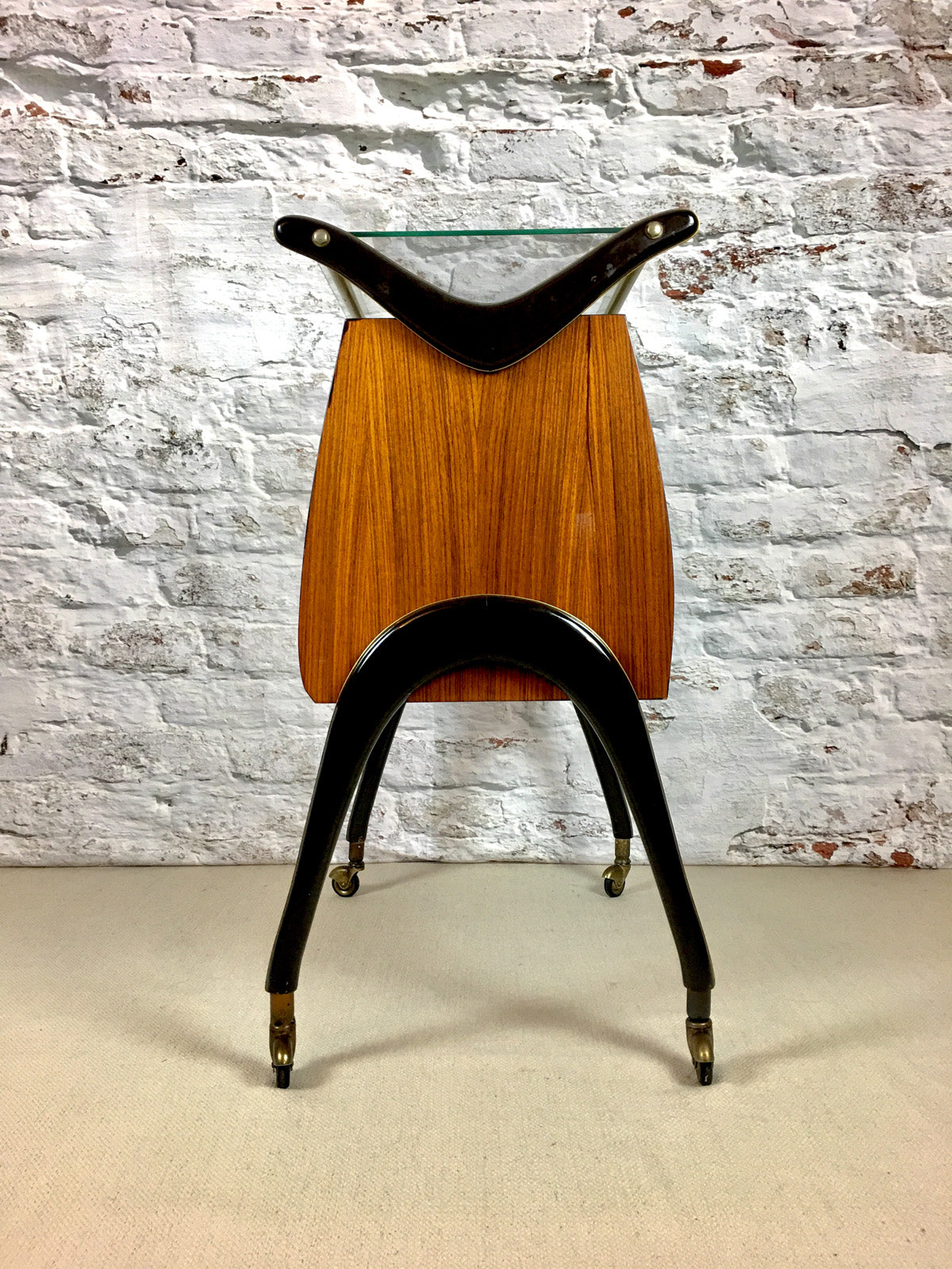 Cesare Lacca war ein italienischer Architekt und Designer, der für seine außergewöhnlichen Barwagen und die kunstfertige Verarbeitung von Messing bekannt wurde. Seine eleganten Messing Arbeiten sind unter Sammlern hoch gefragt und hauptsächlich aus der Zeit um 1950/60. Sein berühmtester Teewagen wurde von Cassina produziert, Arredoluce versorgte er jedoch auch mit seinen Entwürfen. Leider ist nicht bekannt, wie sich seine Karriere ab den 1960er Jahren entwickelte. Heute wird Lacca für seinen Beitrag zur italienischen Designidentität hoch geschätzt.