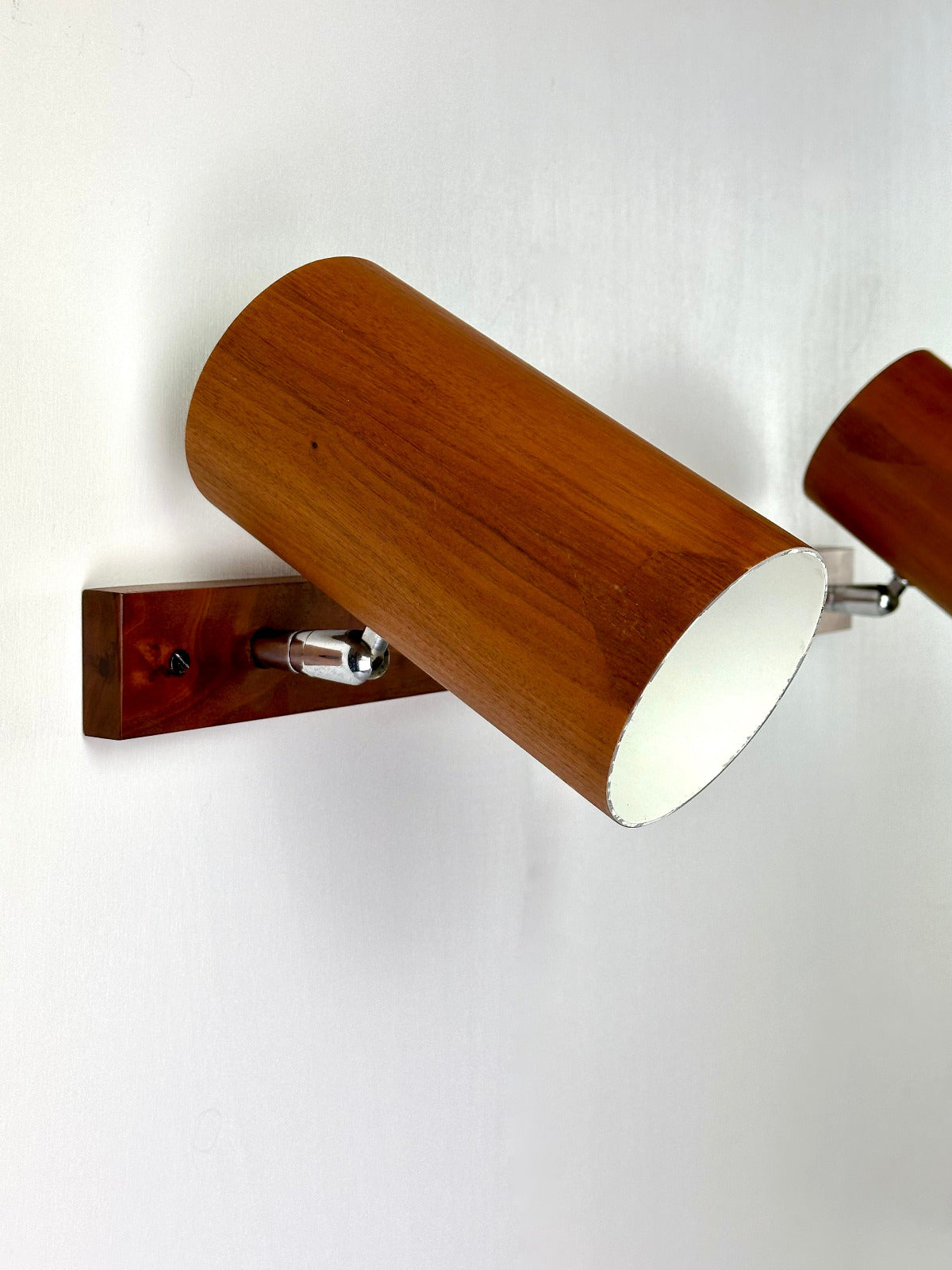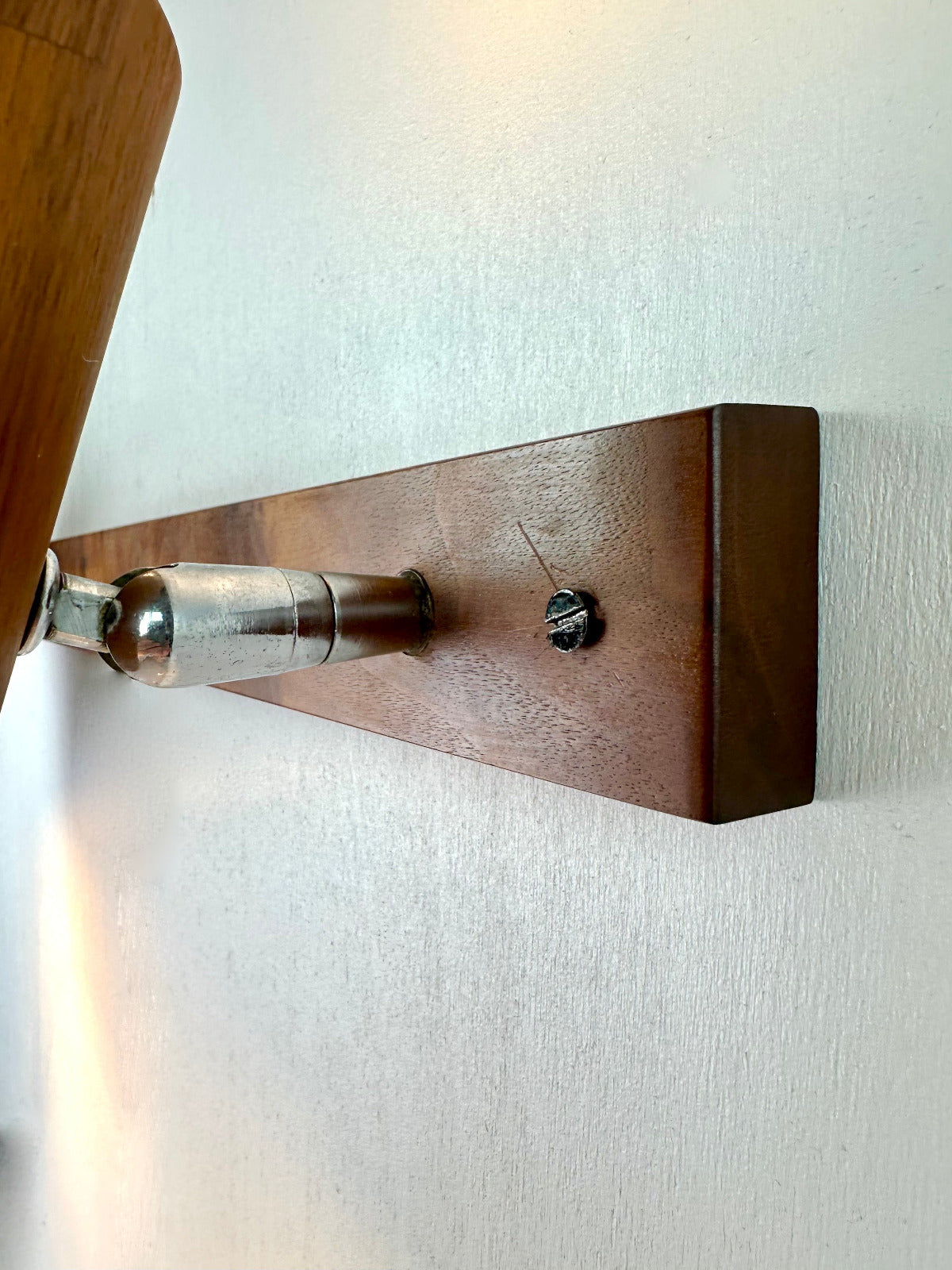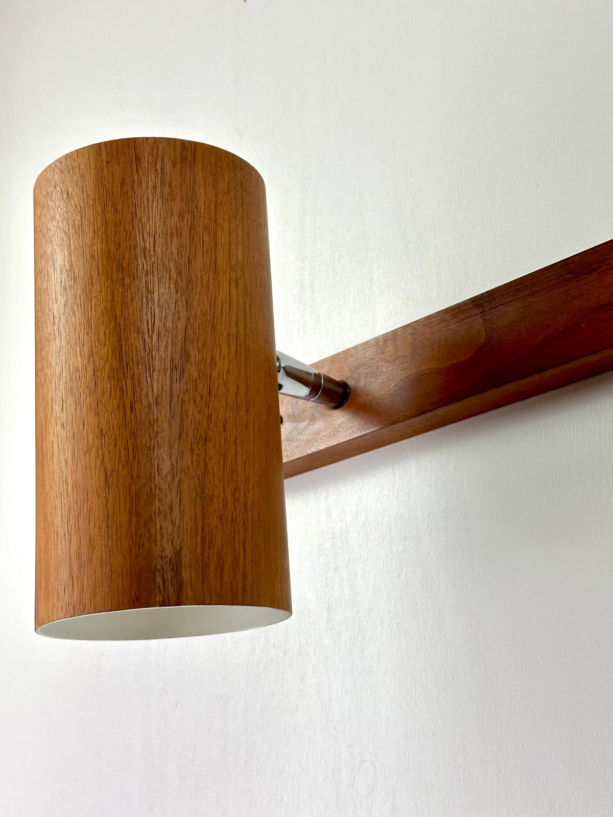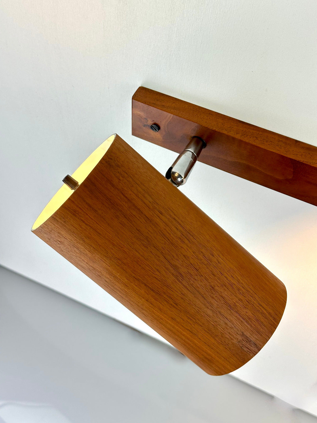 - Die Leuchte ist zur Wandmontage vorgesehen und ruht auf einer massiven Walnuss-Holzleiste, die den architektonischen Charakter betont. Innen ist der Schirm weiß lackiert und mit einer originalen Bakelit-Fassung von Leviton (Made in USA) ausgestattet – ein Qualitätsmerkmal, das die sorgfältige handwerkliche Verarbeitung der Epoche unterstreicht. Das verchromte, massiv gefertigte Kugelgelenk erlaubt eine präzise Ausrichtung des Lichts und zeugt von technischer Raffinesse und Langlebigkeit.