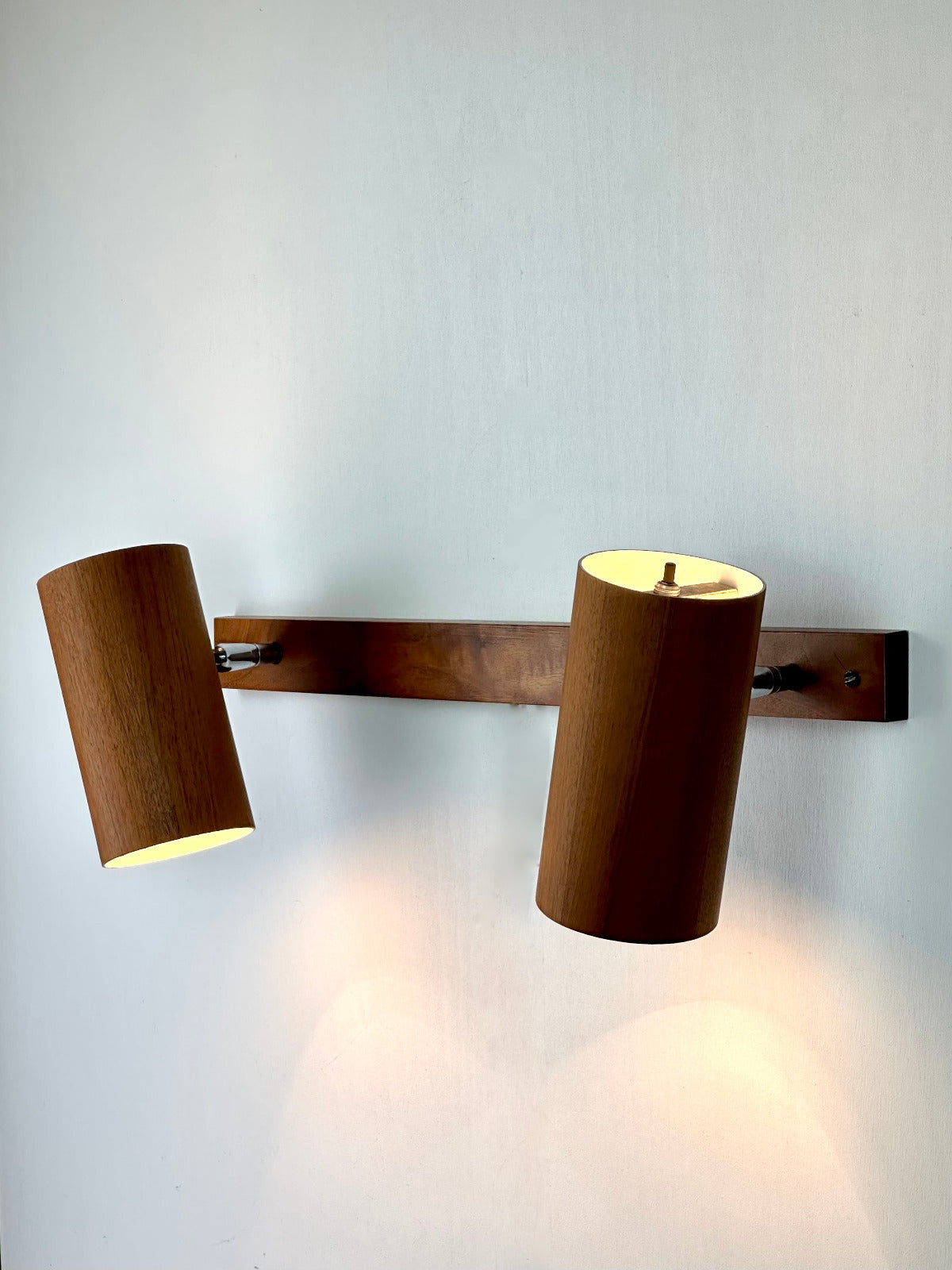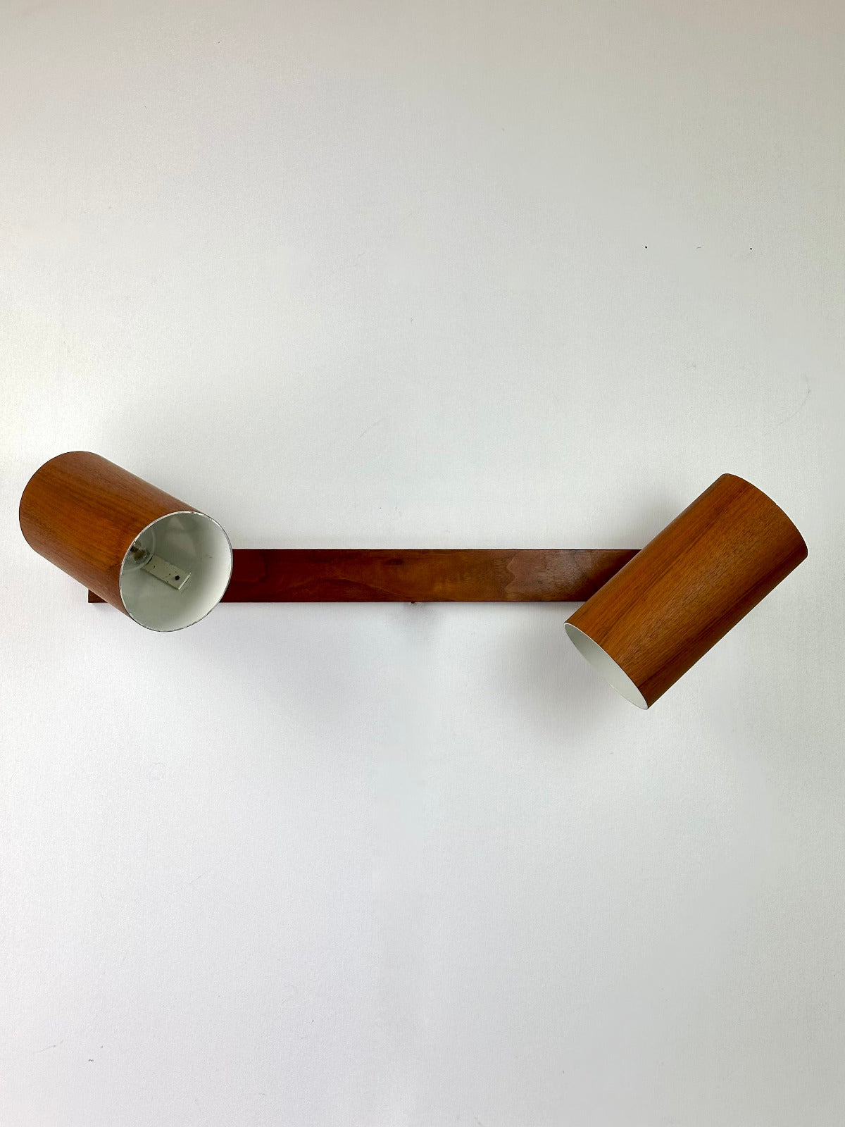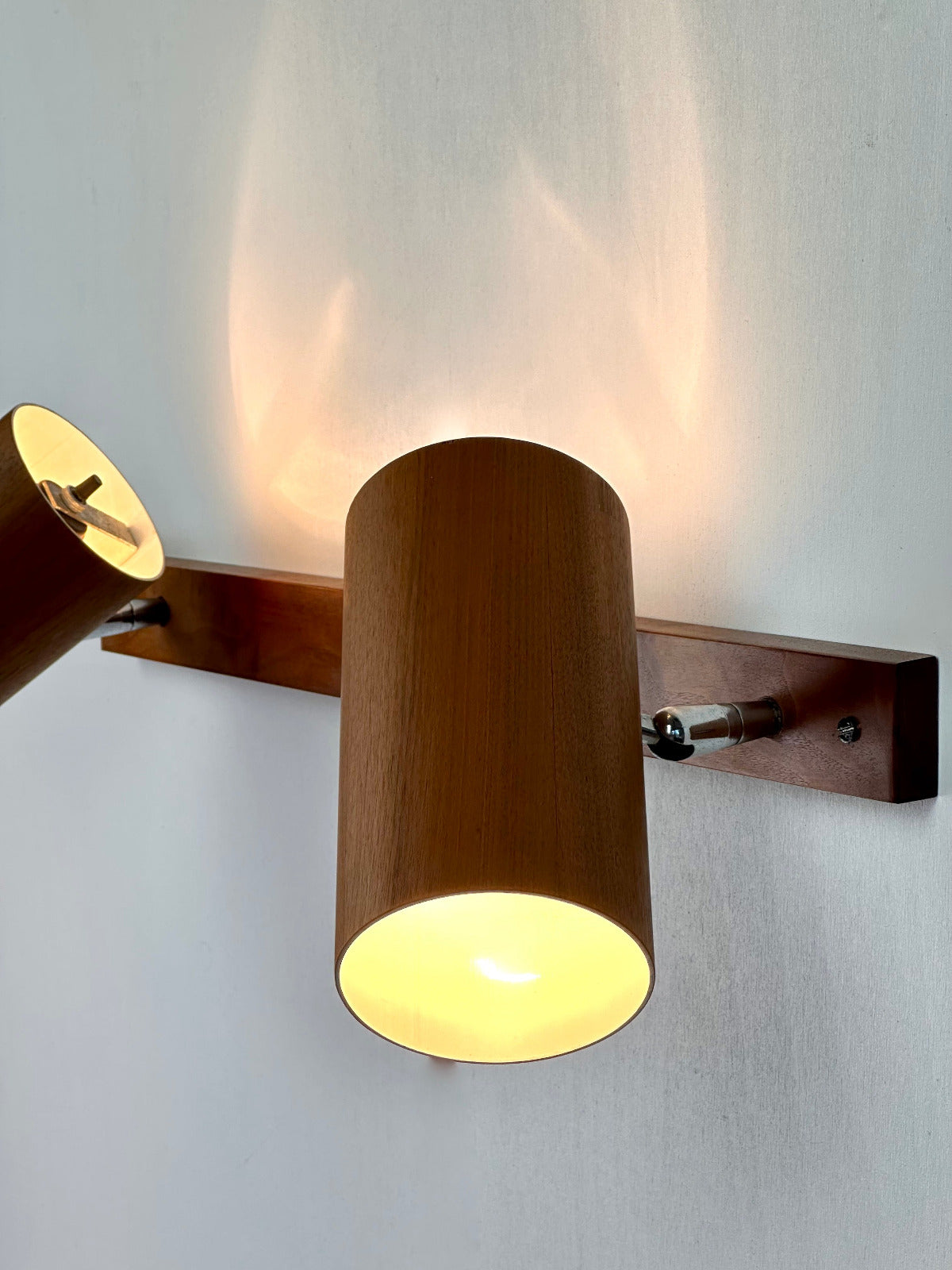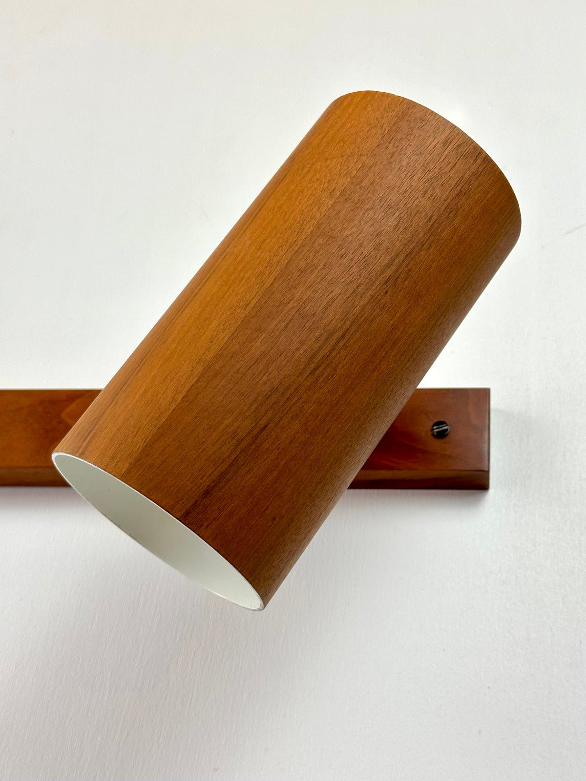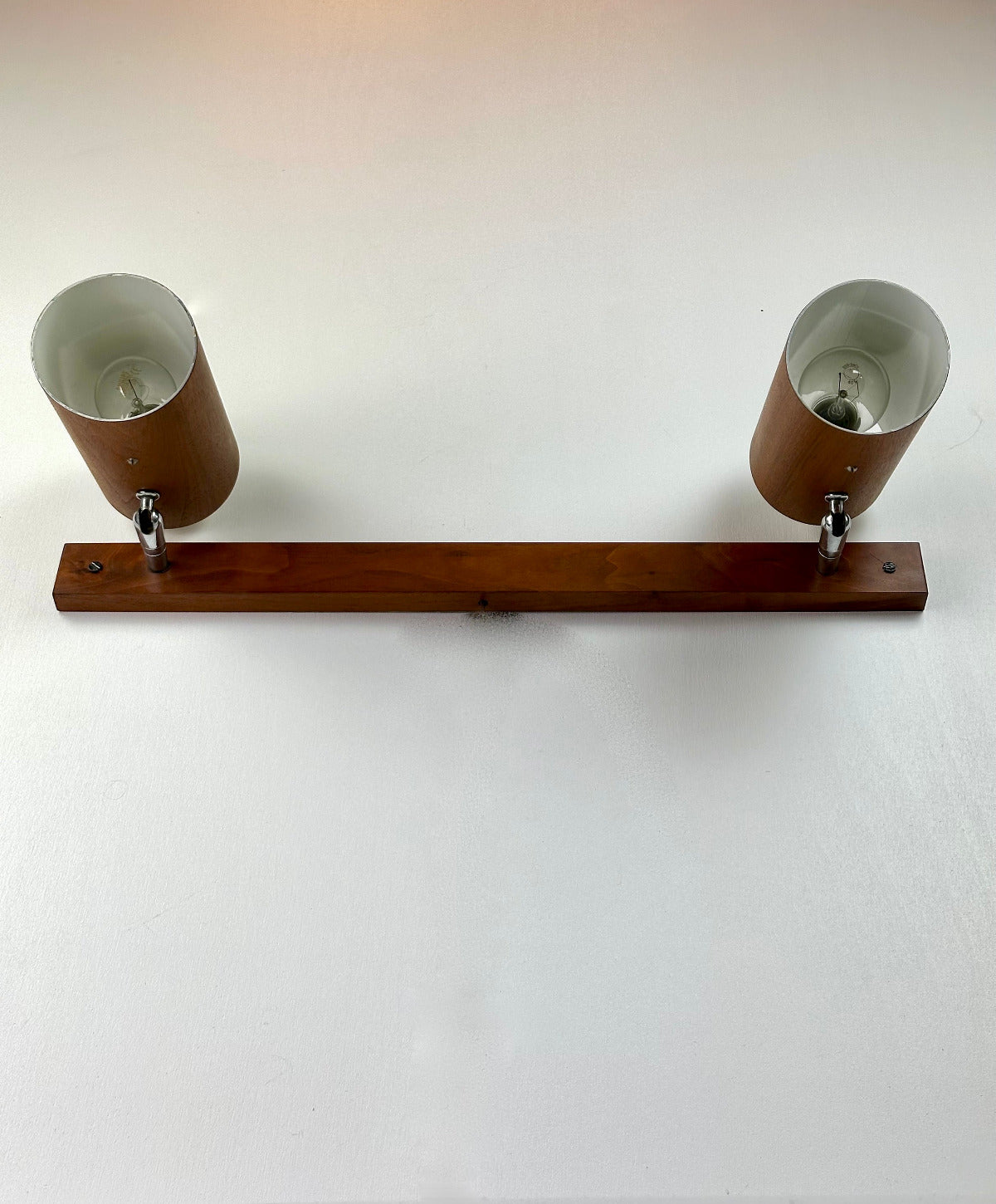 - Die Leuchte ist zur Wandmontage vorgesehen und ruht auf einer massiven Walnuss-Holzleiste, die den architektonischen Charakter betont. Innen ist der Schirm weiß lackiert und mit einer originalen Bakelit-Fassung von Leviton (Made in USA) ausgestattet – ein Qualitätsmerkmal, das die sorgfältige handwerkliche Verarbeitung der Epoche unterstreicht. Das verchromte, massiv gefertigte Kugelgelenk erlaubt eine präzise Ausrichtung des Lichts und zeugt von technischer Raffinesse und Langlebigkeit.