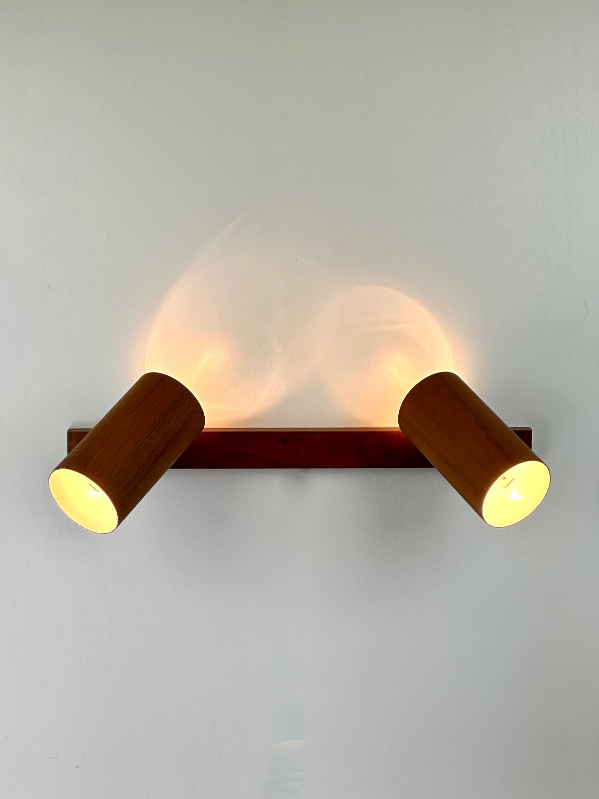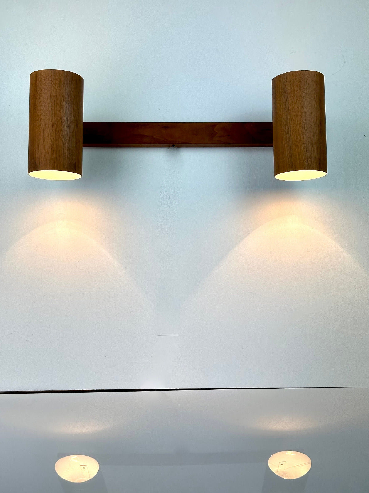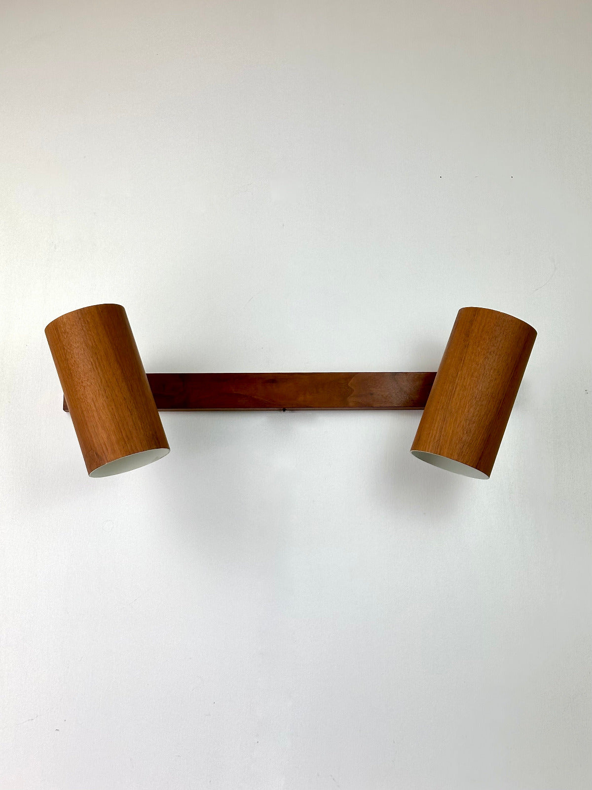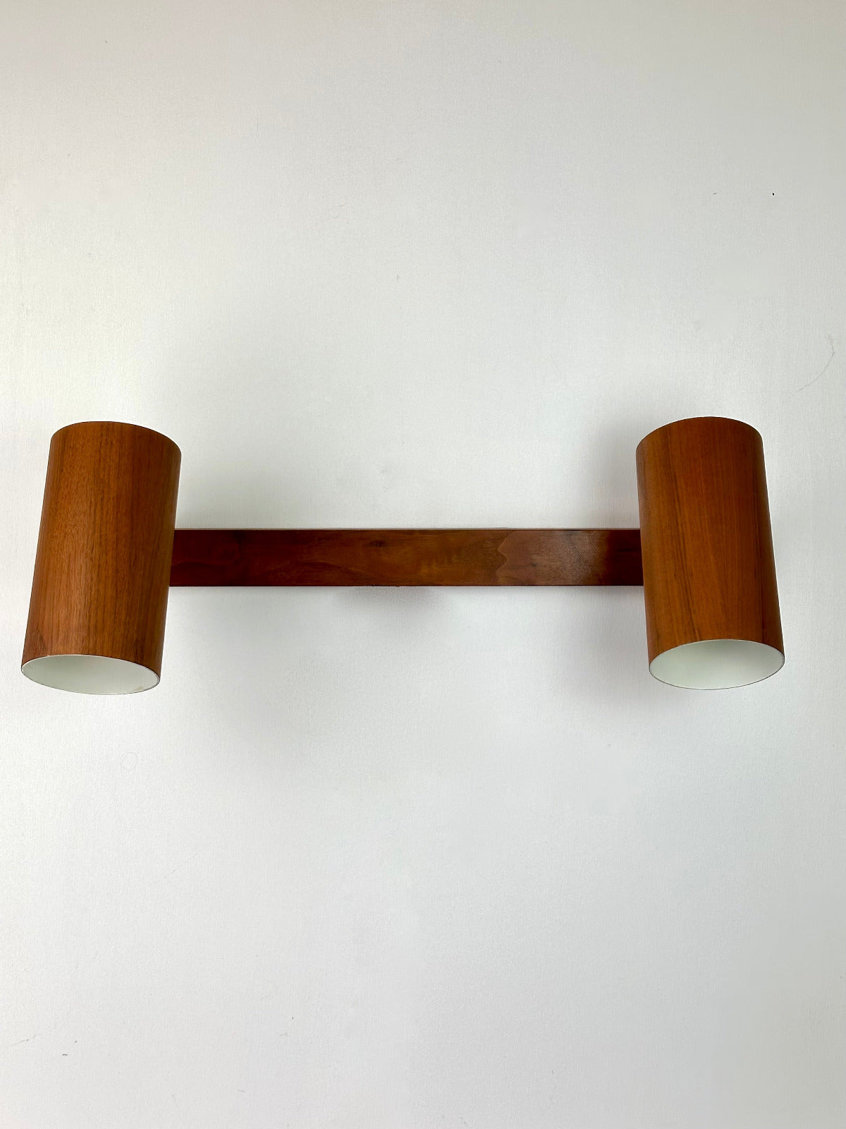 - Die Leuchte ist zur Wandmontage vorgesehen und ruht auf einer massiven Walnuss-Holzleiste, die den architektonischen Charakter betont. Innen ist der Schirm weiß lackiert und mit einer originalen Bakelit-Fassung von Leviton (Made in USA) ausgestattet – ein Qualitätsmerkmal, das die sorgfältige handwerkliche Verarbeitung der Epoche unterstreicht. Das verchromte, massiv gefertigte Kugelgelenk erlaubt eine präzise Ausrichtung des Lichts und zeugt von technischer Raffinesse und Langlebigkeit.