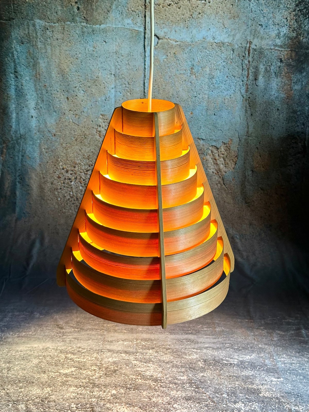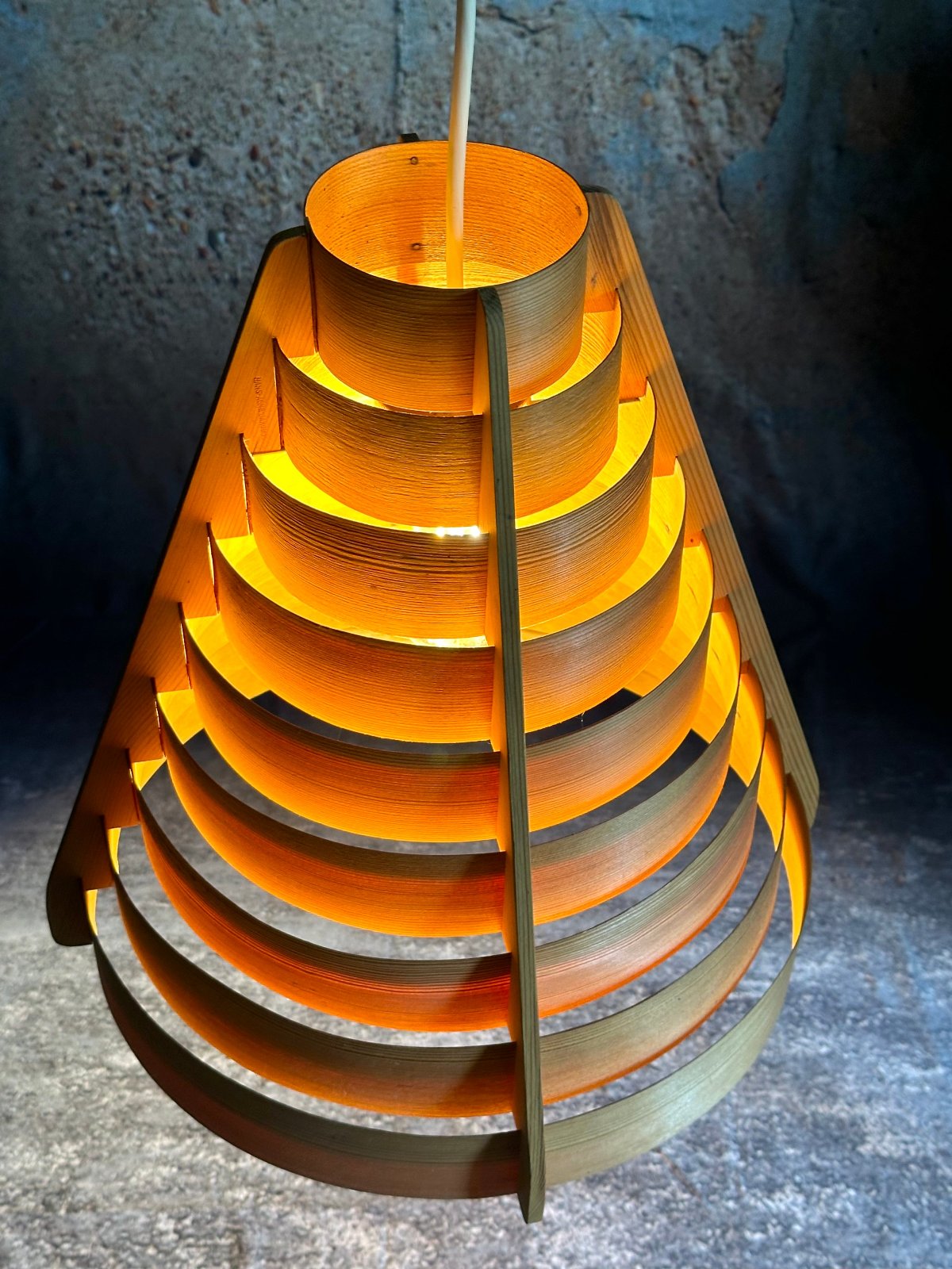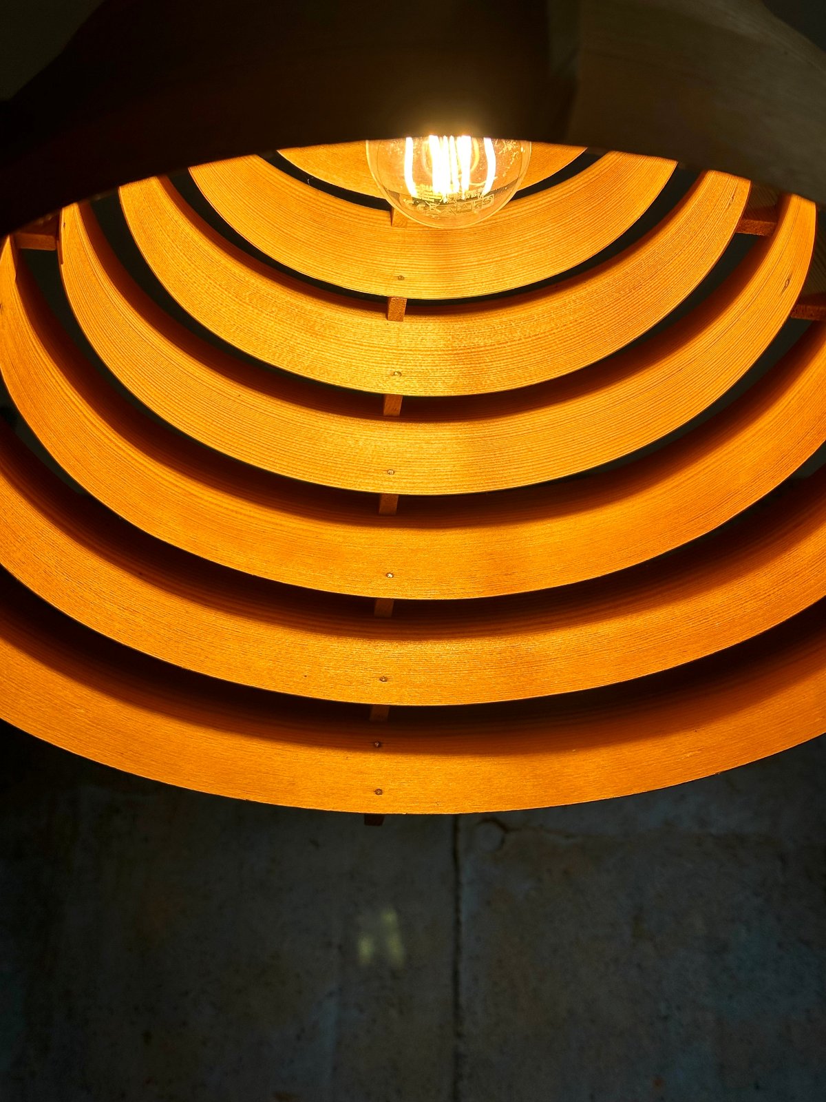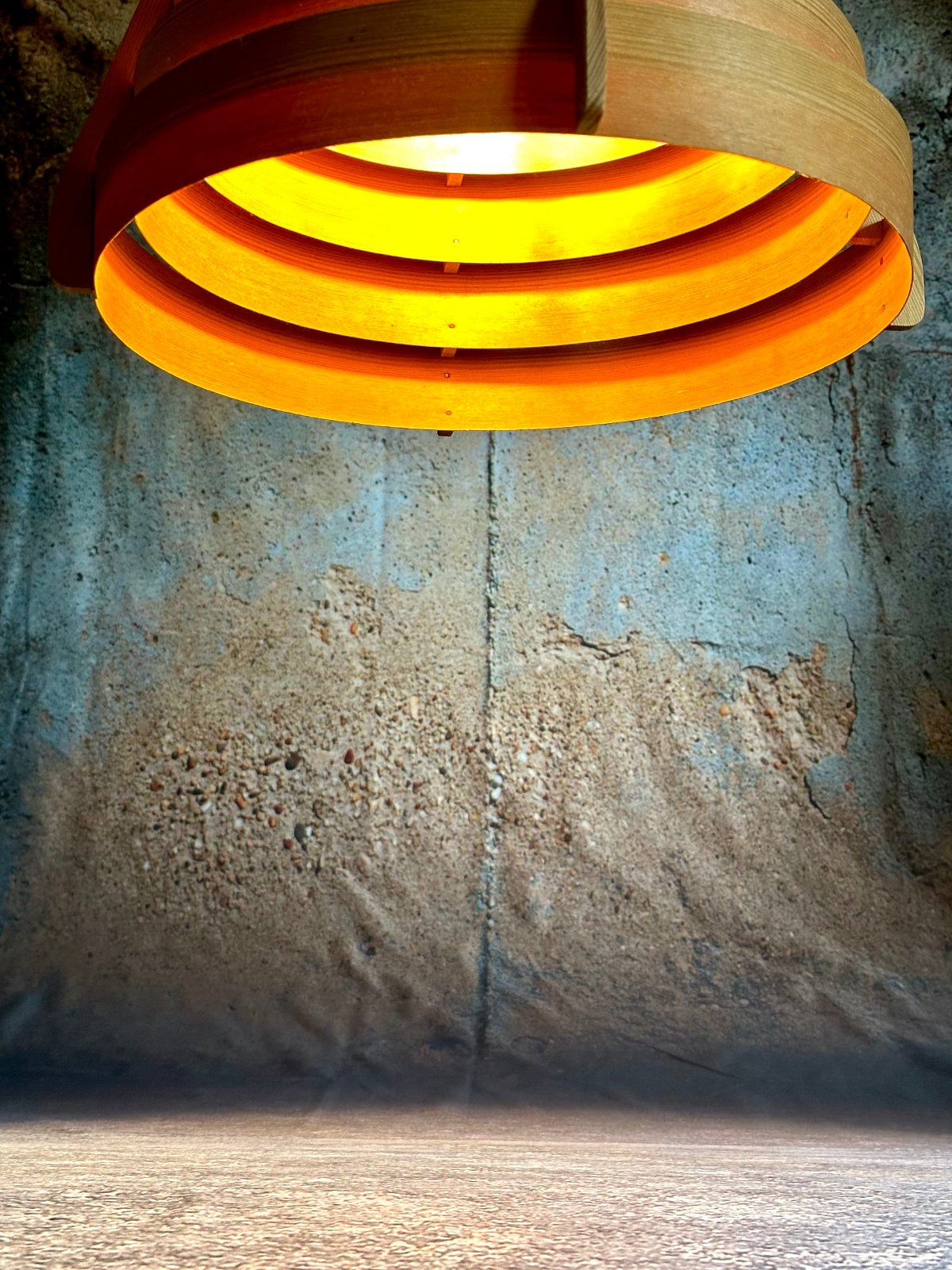Das hochwertige Holz, aus dem die Lamellen gefertigt sind, verleiht der Lampe eine warme und natürliche Ausstrahlung, die das Licht sanft filtert und eine angenehme, atmosphärische Beleuchtung schafft.