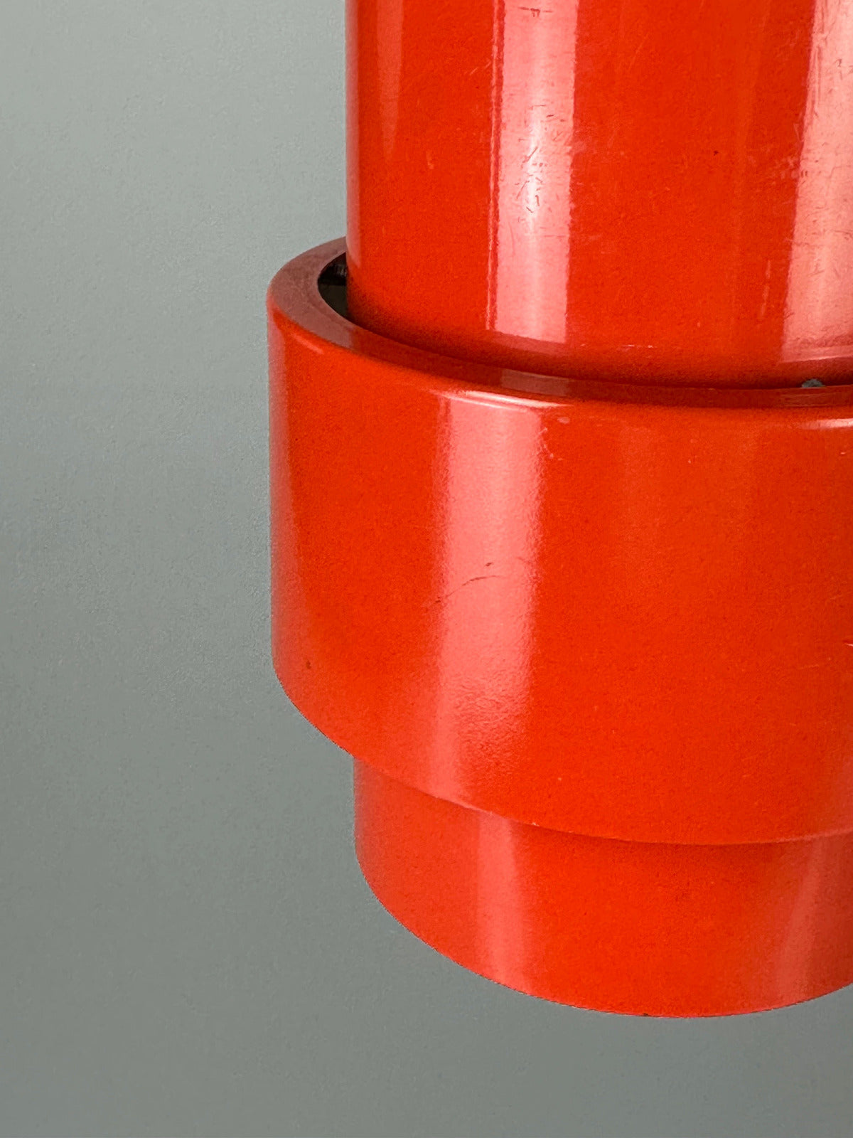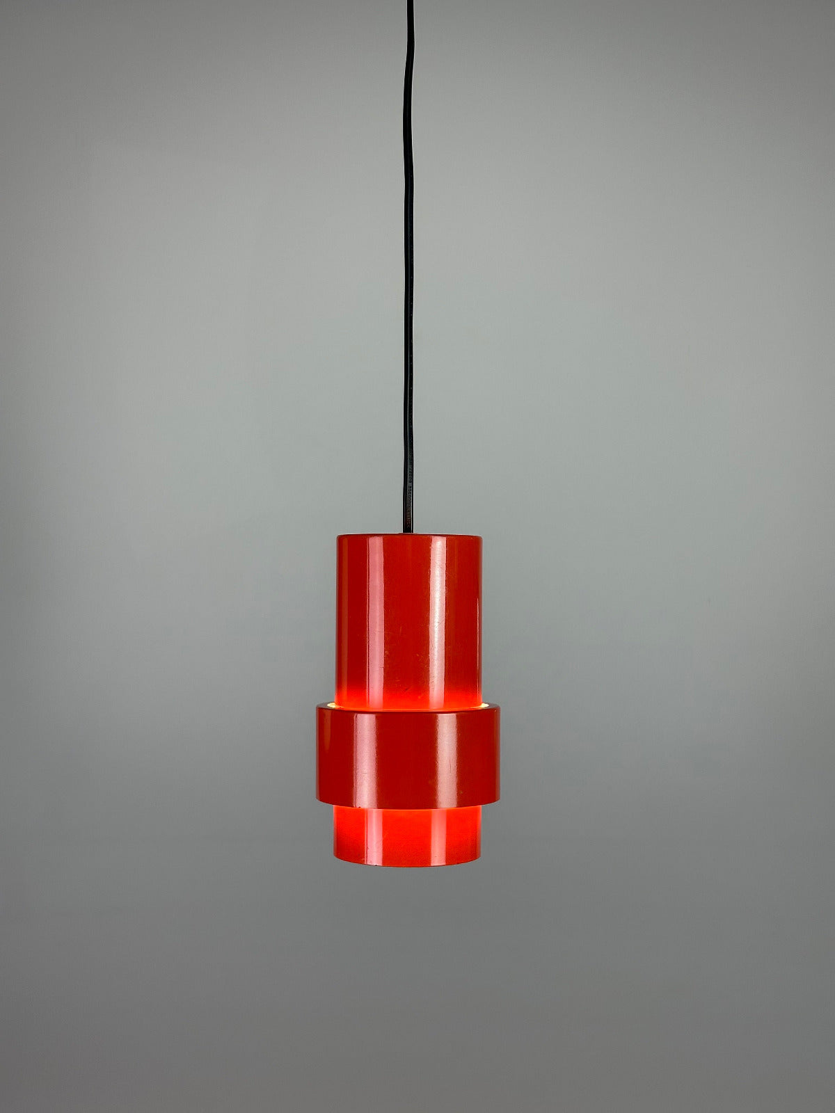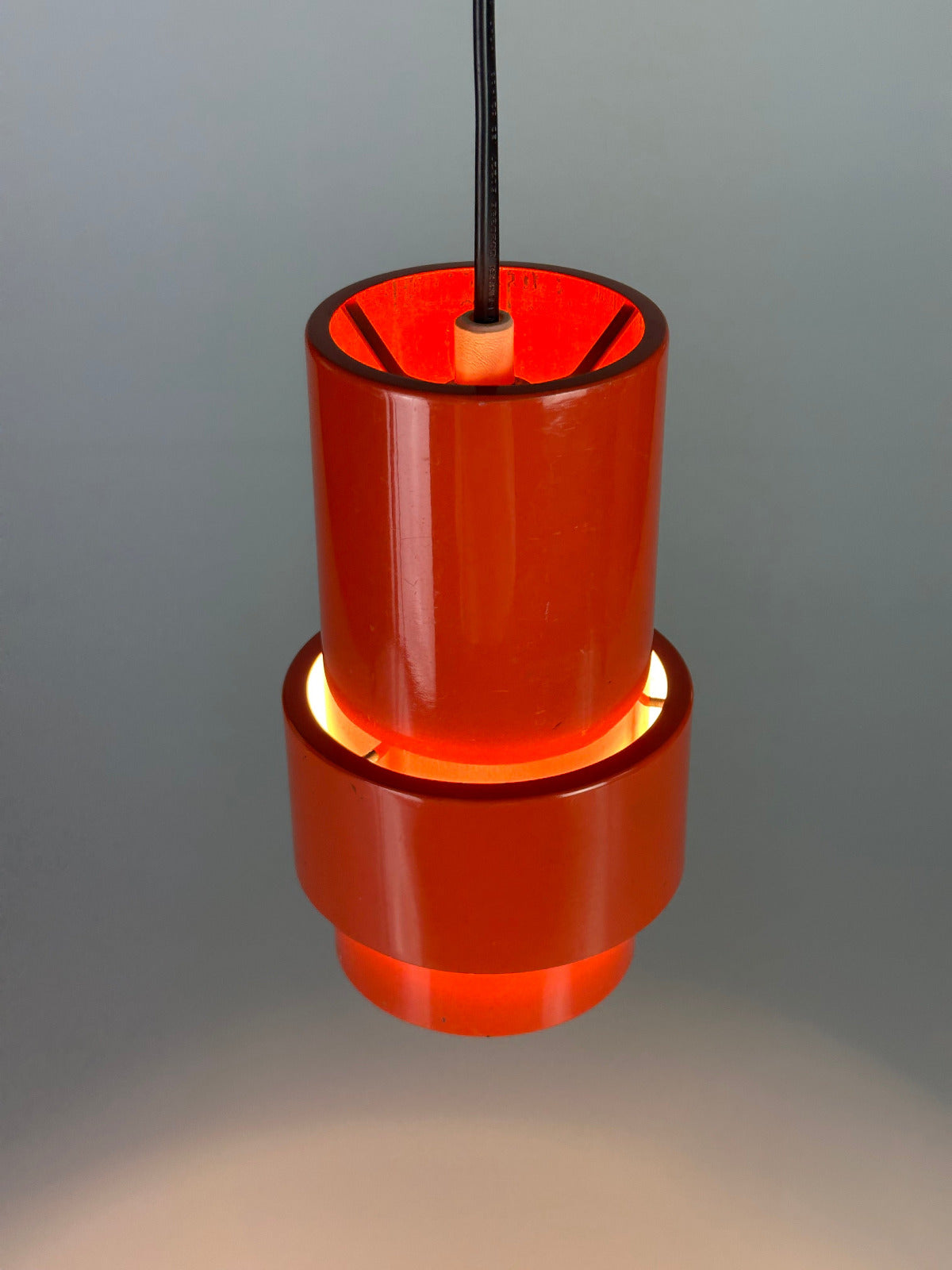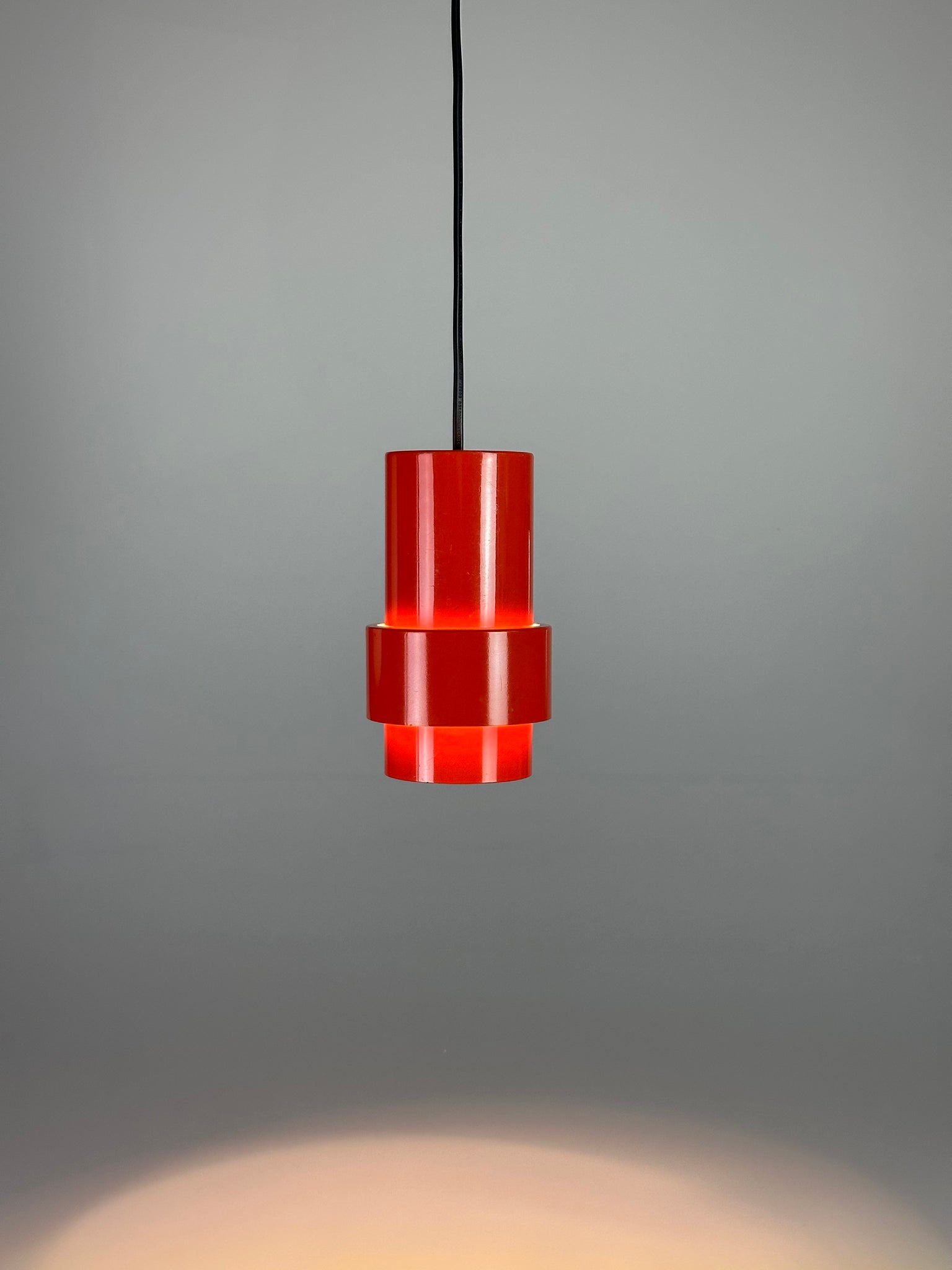 Erst im eingeschalteten Zustand zeigt sich ihre eigentliche Qualität. Das kräftige Rot-Orange des hochglänzend lackierten Metallkorpus beginnt zu leuchten, das Licht bricht sich im Inneren und erzeugt einen warmen, beinahe glühenden Schimmer. Die differenzierte Innenlackierung lenkt das Licht gezielt und schafft eine indirekte, atmosphärische Ausstrahlung mit überraschender Tiefe. Die Leuchte wirkt dann weniger wie ein Gebrauchsgegenstand als wie ein schwebendes Farbobjekt.