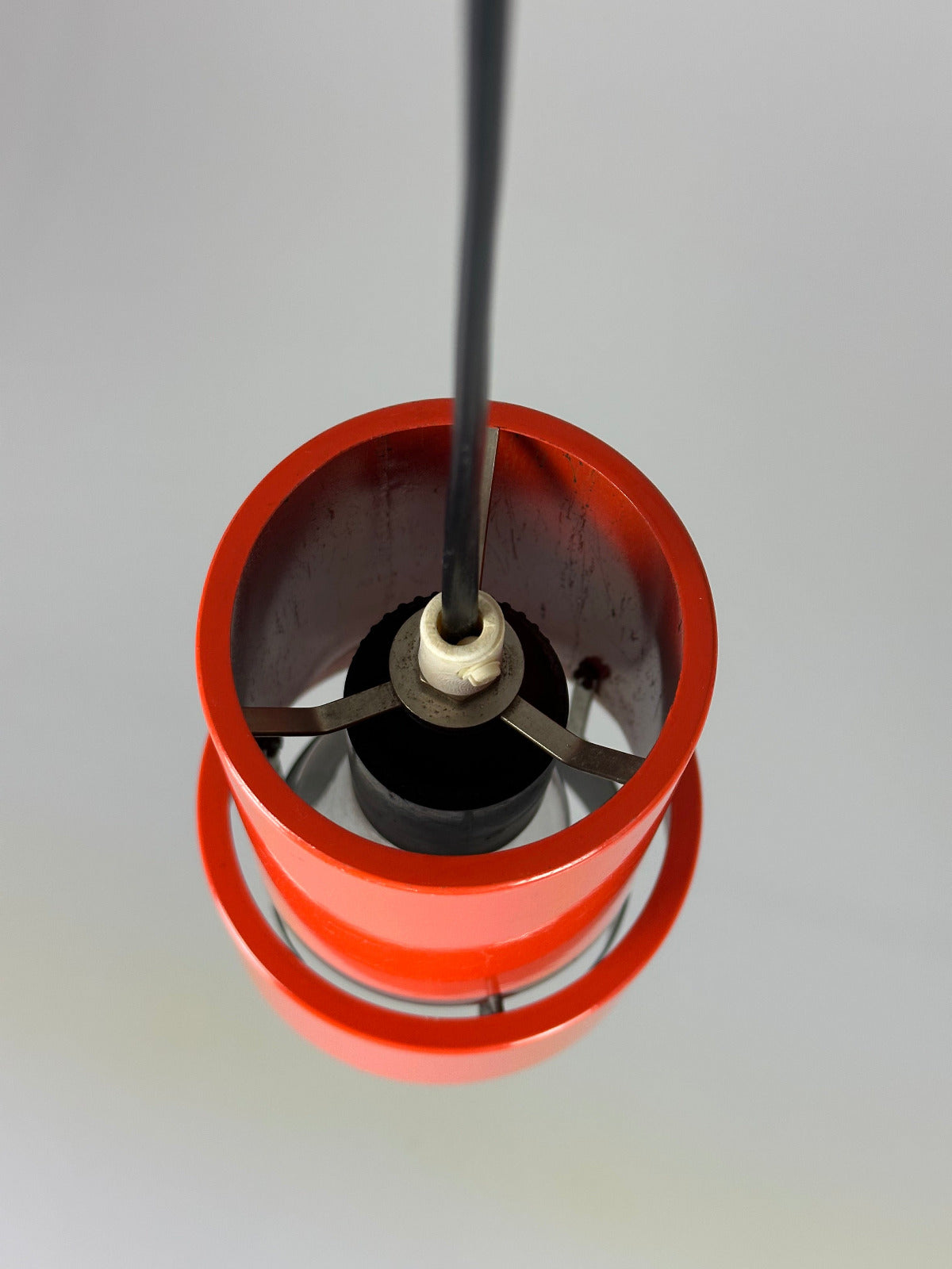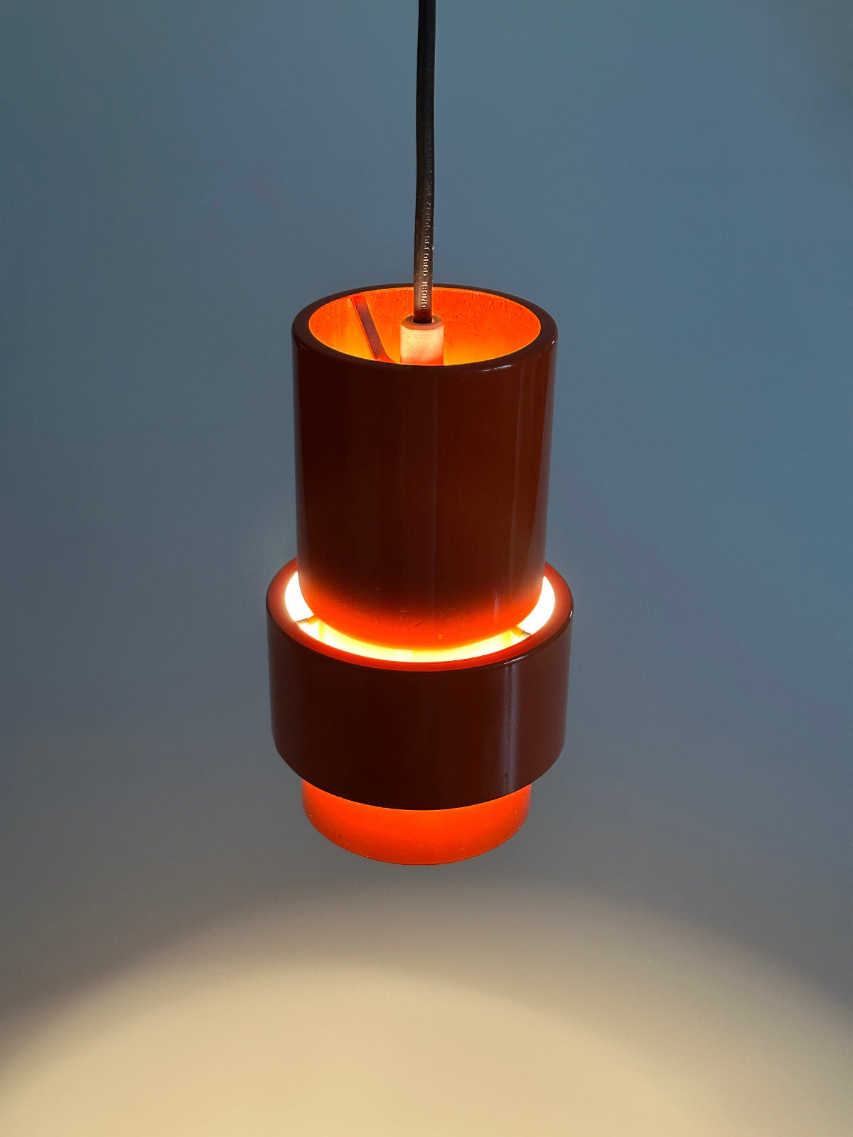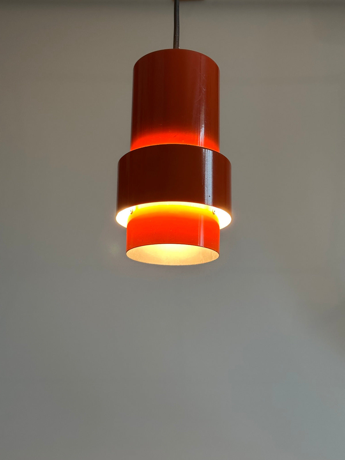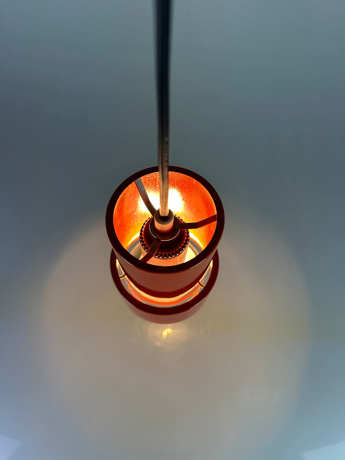 Erst im eingeschalteten Zustand zeigt sich ihre eigentliche Qualität. Das kräftige Rot-Orange des hochglänzend lackierten Metallkorpus beginnt zu leuchten, das Licht bricht sich im Inneren und erzeugt einen warmen, beinahe glühenden Schimmer. Die differenzierte Innenlackierung lenkt das Licht gezielt und schafft eine indirekte, atmosphärische Ausstrahlung mit überraschender Tiefe. Die Leuchte wirkt dann weniger wie ein Gebrauchsgegenstand als wie ein schwebendes Farbobjekt.