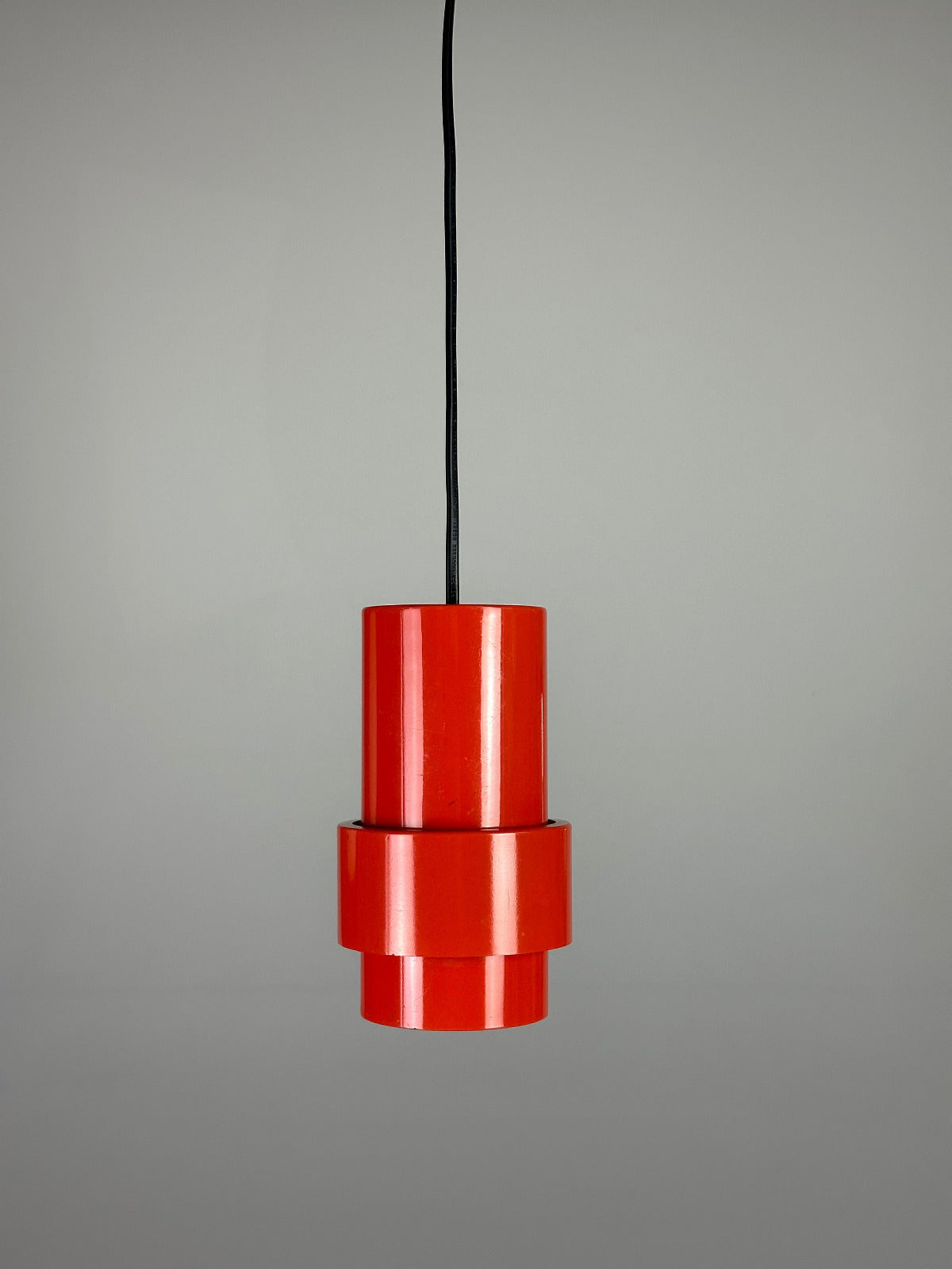Diese außergewöhnliche Pendelleuchte aus Italien, entstanden rund um 1960, wirkt im ausgeschalteten Zustand wie ein reduziertes Industrieobjekt – klar, konzentriert, fast streng. Drei präzise gestaffelte Zylinder formen eine kompakte, architektonische Silhouette, deren Proportionen bewusst gesetzt sind. Die sichtbare Konstruktion ist kein Zufall, sondern Teil des gestalterischen Ausdrucks: Technik wird hier nicht verborgen, sondern gestaltet.