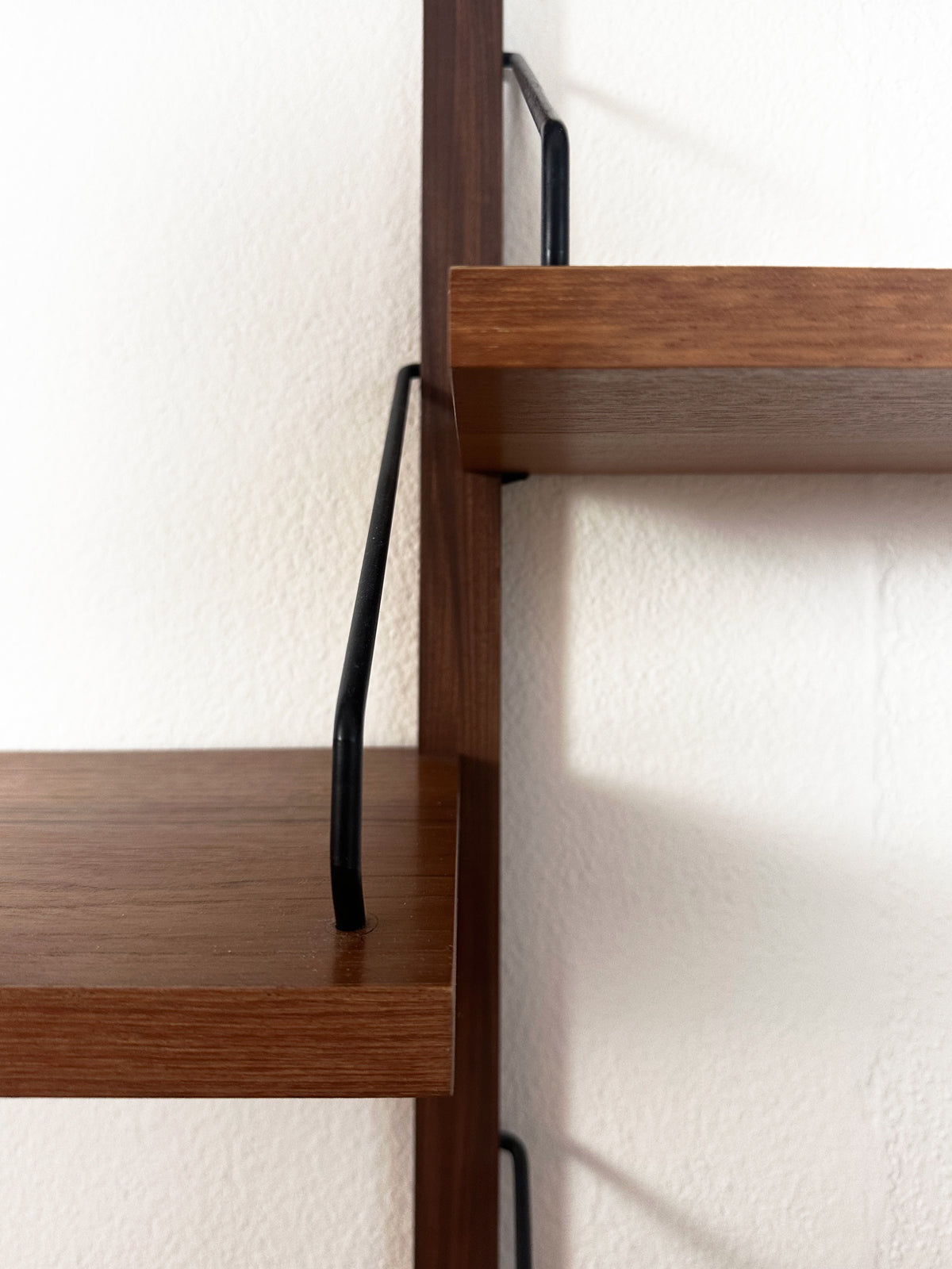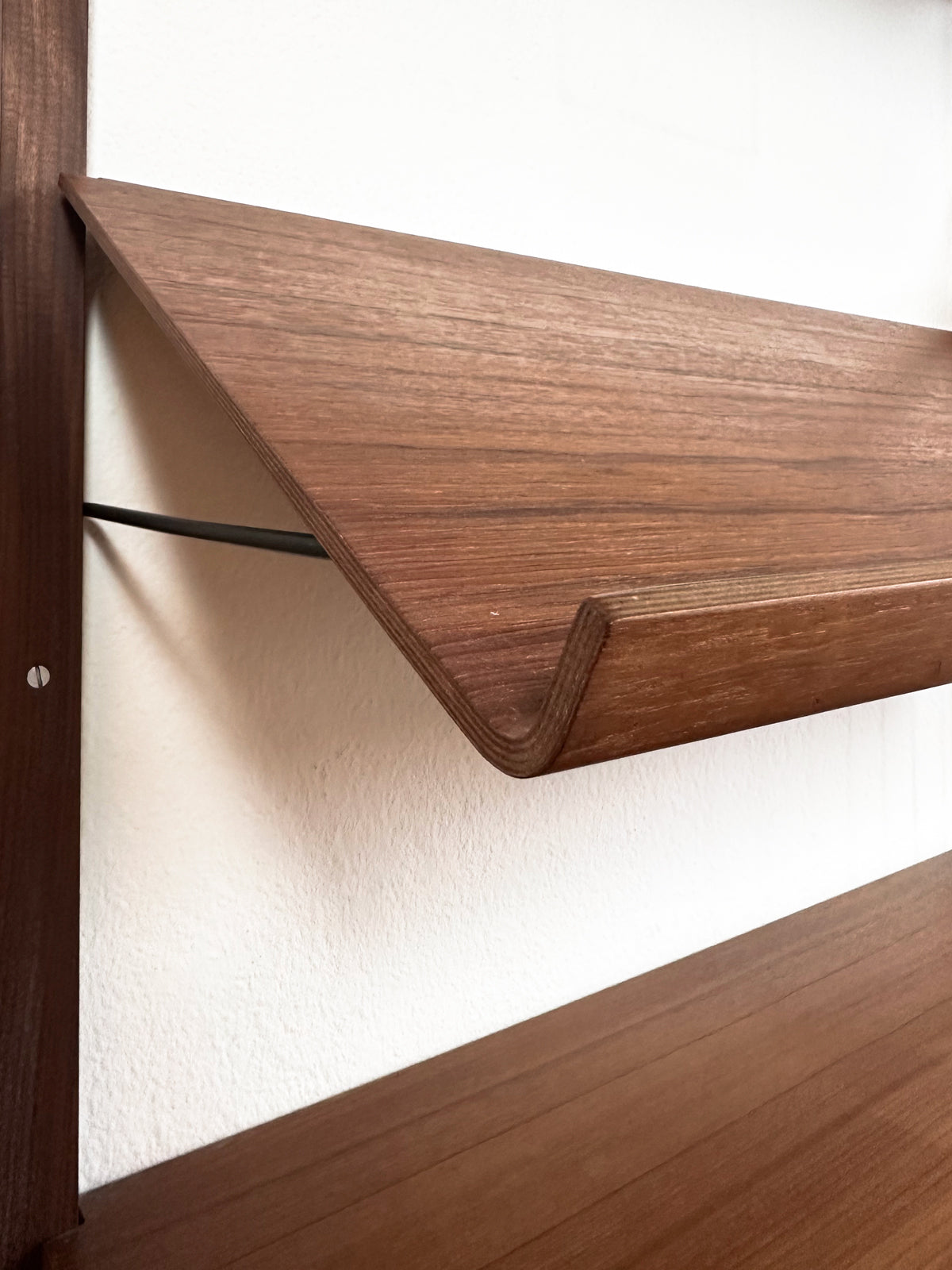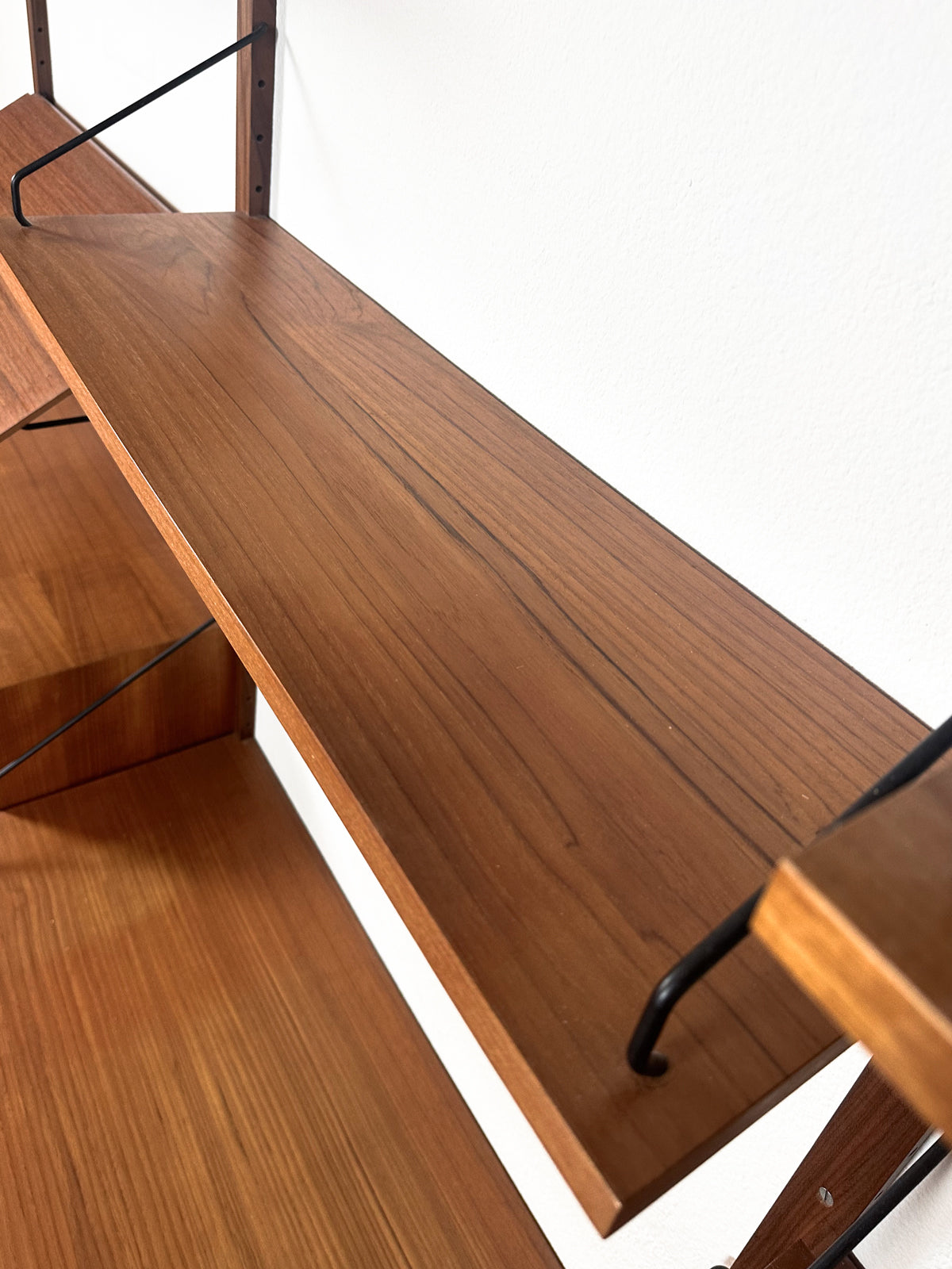 Diese Ausführung in Teakholz mit einer eleganten Ecklösung gehört zu den seltensten und begehrtesten Varianten des Systems. Die filigranen Metallträger und warmen Holztöne bilden eine harmonische Einheit, die zeitlos wirkt.