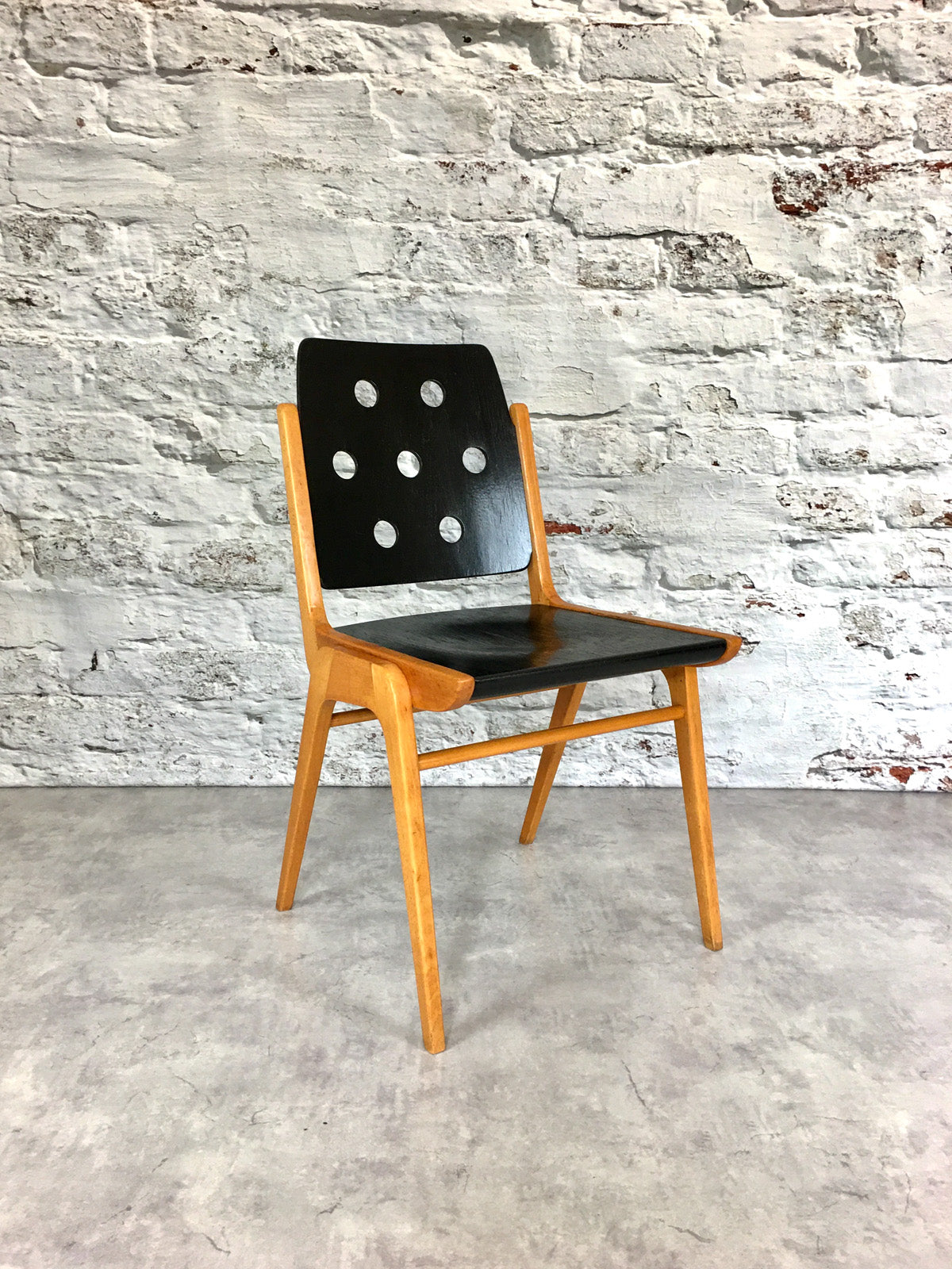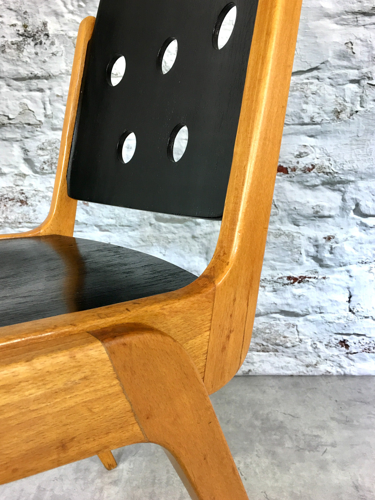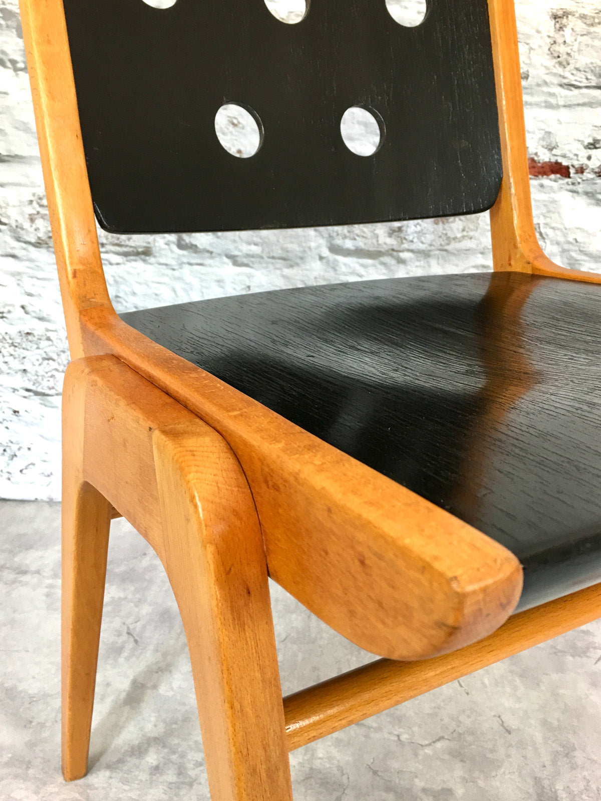Dieser seltene Sessel (Nr.1) von dem österreichischen Architekten Franz Schuster war ein Zufallsfund. Auf ein Inserat hin besuchte ich ein Pfarrhaus in Oberösterreich, das aufgelassen werden sollte. Erstanden hatte ich ursprünglich einen Nierentisch aus den 50er Jahren. Beim Abholtermin tauchten plötzlich diese wunderbaren Sessel auf, welche sich der Pfarrer damals für seine Privatgemächer ausgesucht hatte. Der Zustand war nach so vielen Jahren nicht mehr der Beste, aber sie waren einfach wundervoll. In unserer Werkstatt wurden die Sessel neu verleimt und die Oberfläche konserviert. Ein seltenes Original im Vintage-Bestzustand, bereit für die nächsten Jahrzehnte.