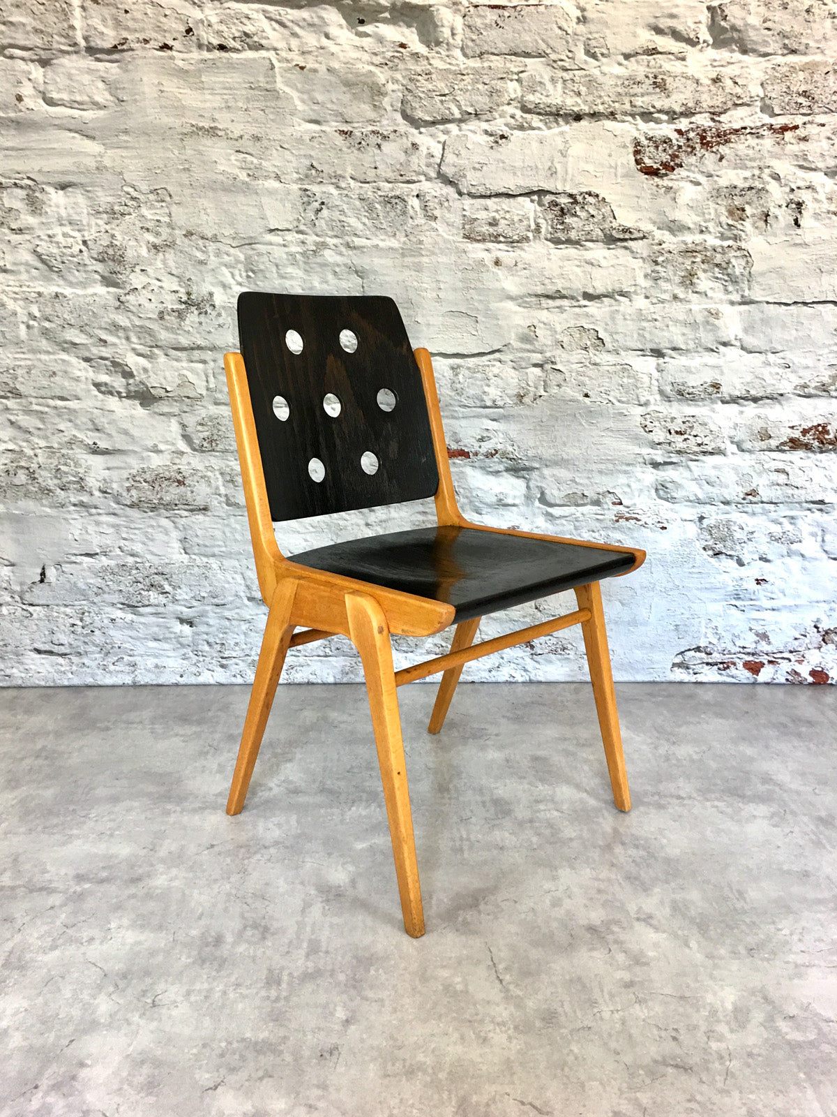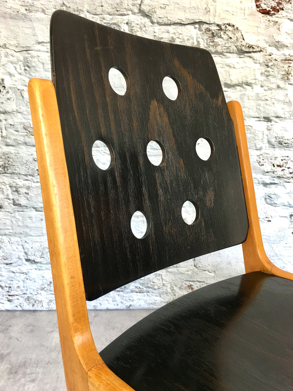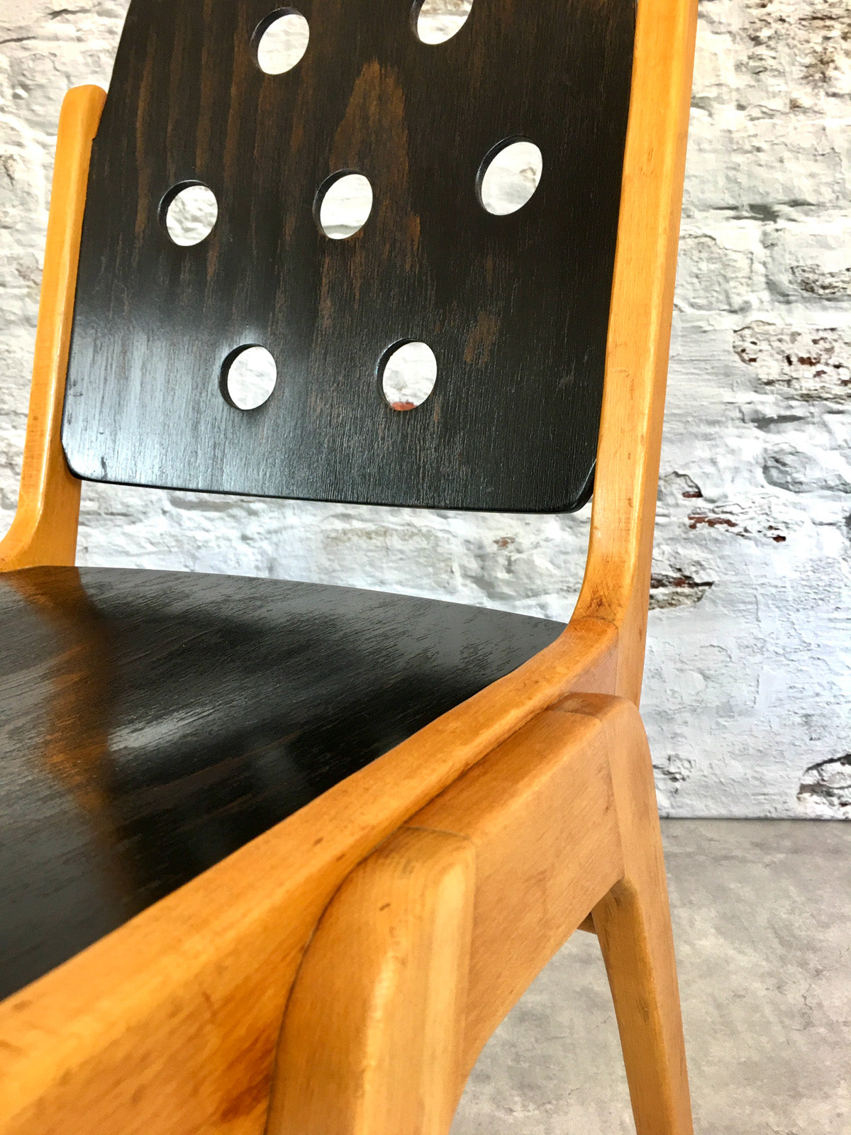 Dieser seltene Sessel (Nr.2) von dem österreichischen Architekten Franz Schuster war ein Zufallsfund. Auf ein Inserat hin besuchte ich ein Pfarrhaus in Oberösterreich, das aufgelassen werden sollte. Erstanden hatte ich ursprünglich einen Nierentisch aus den 50er Jahren. Beim Abholtermin tauchten plötzlich diese wunderbaren Sessel auf, welche sich der Pfarrer damals für seine Privatgemächer ausgesucht hatte. Der Zustand war nach so vielen Jahren nicht mehr der Beste, aber sie waren einfach wundervoll. In unserer Werkstatt wurden die Sessel neu verleimt und die Oberfläche konserviert. Ein seltenes Original im Vintage-Bestzustand, bereit für die nächsten Jahrzehnte.