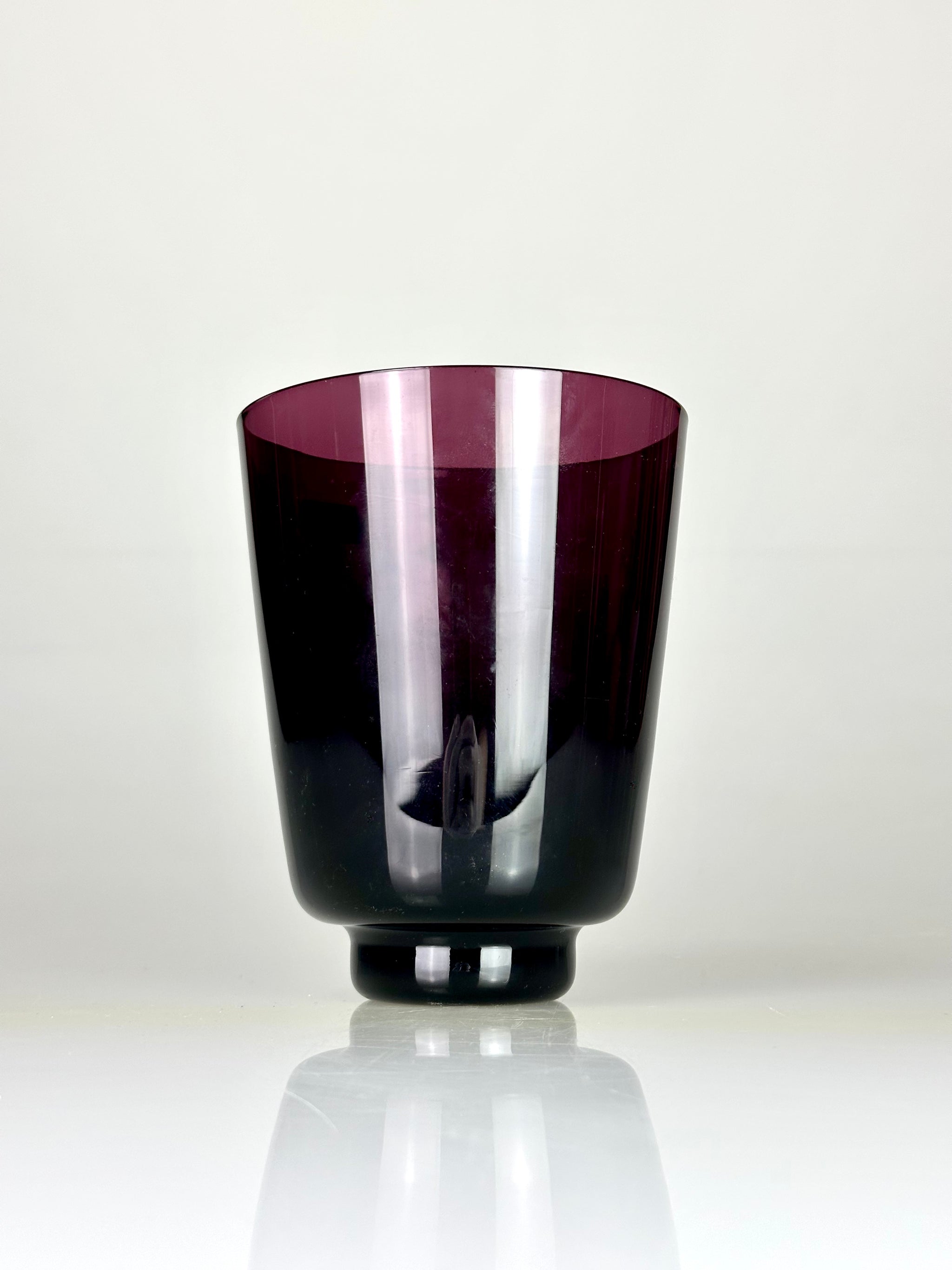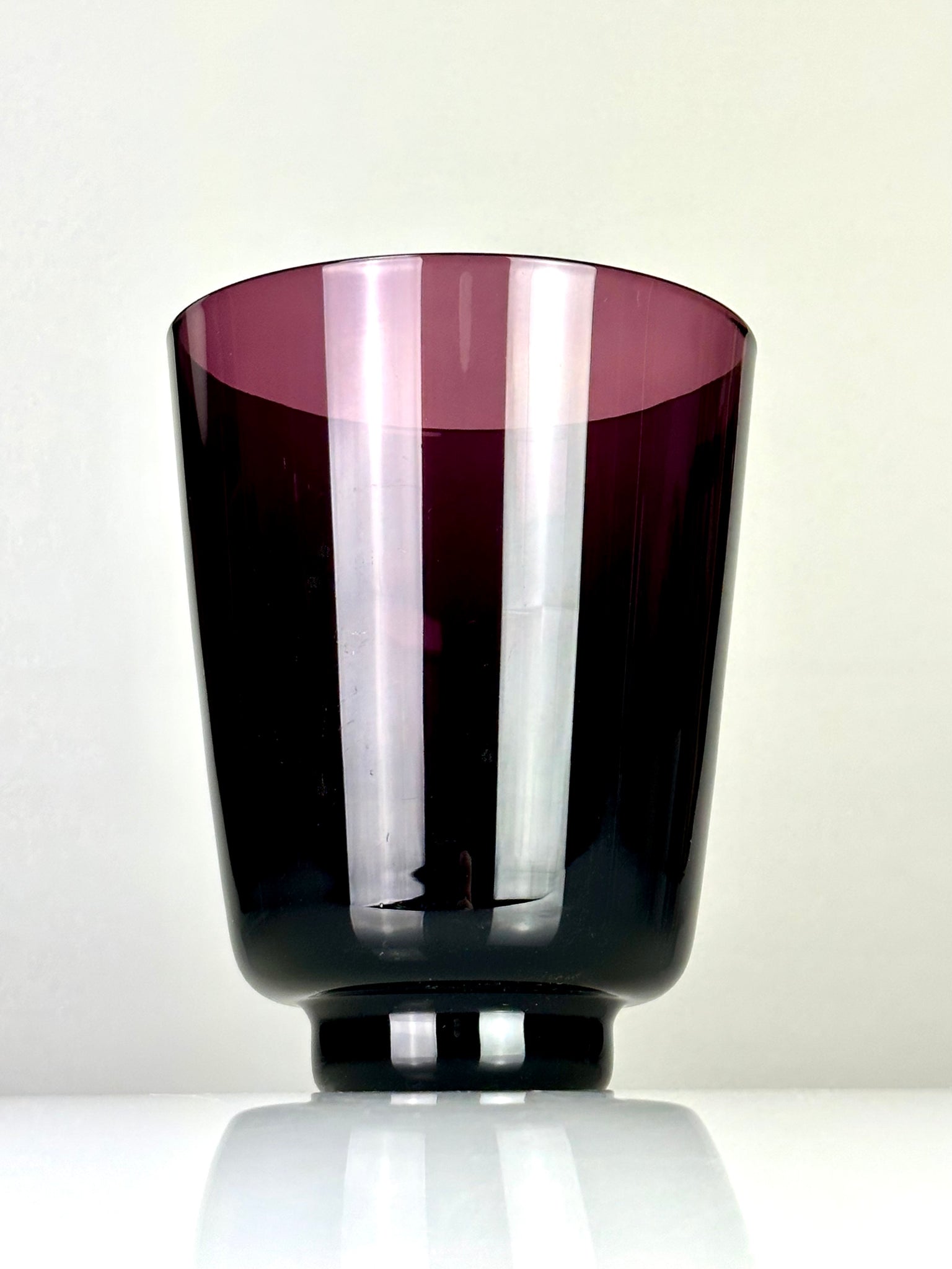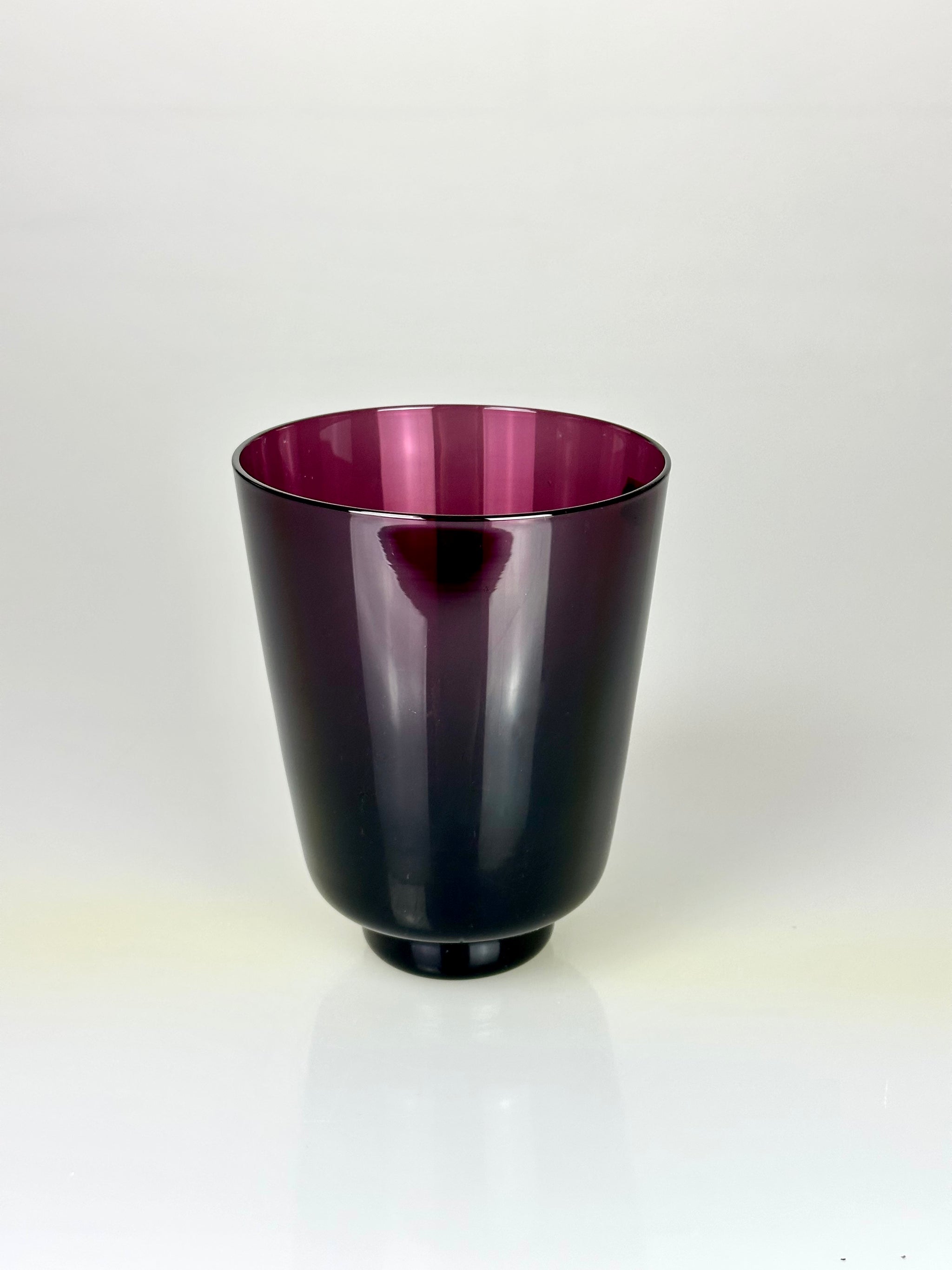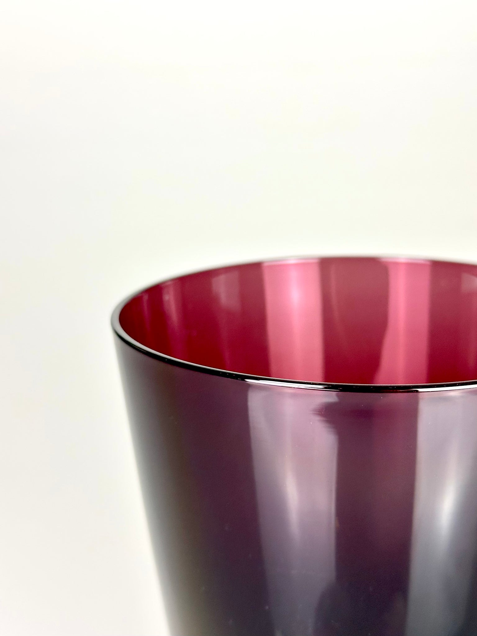 Das Glas, in einem tiefen Violettton gehalten, wirkt je nach Lichteinfall fast schwarz oder überraschend transparent. Gerade dieses Spiel verleiht der Vase ihre besondere Präsenz. Sie funktioniert ohne Blumen ebenso überzeugend wie mit einem einzelnen Zweig.