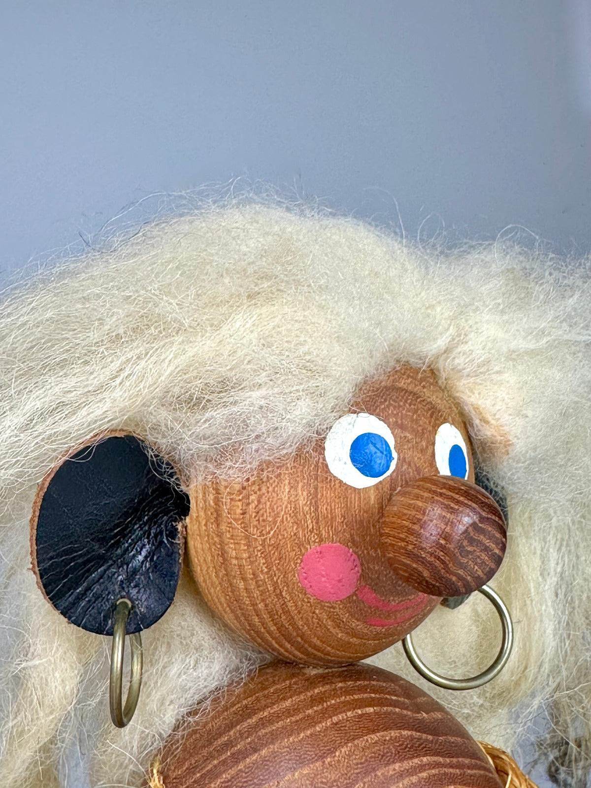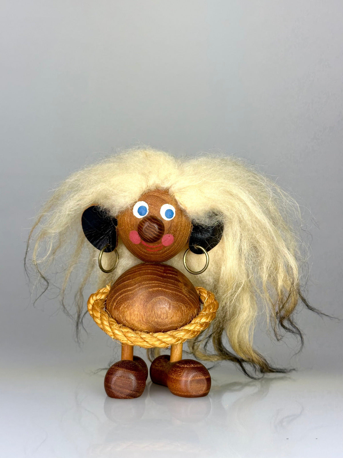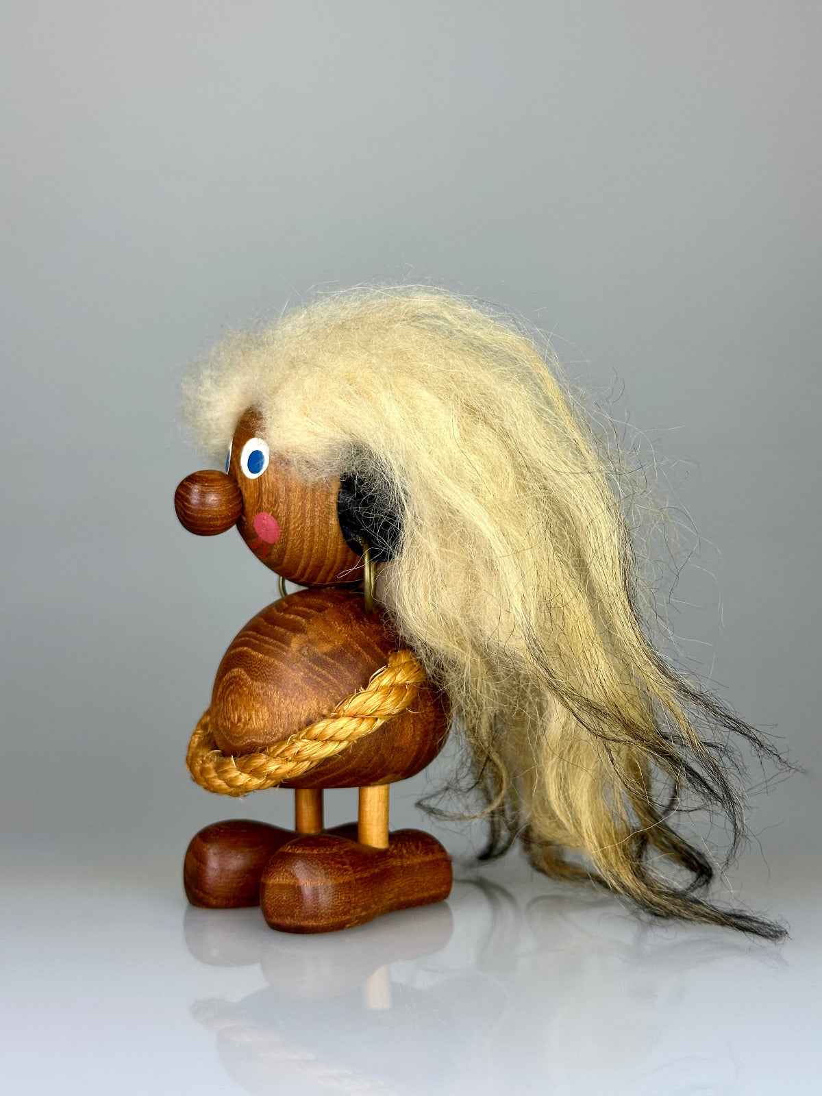 Die applizierten Details – Augen, Knöpfe, Kordel – sind reduziert, aber präzise gesetzt und verleihen der Figur ihren unverwechselbaren Ausdruck zwischen Neugier und augenzwinkernder Selbstbehauptung.